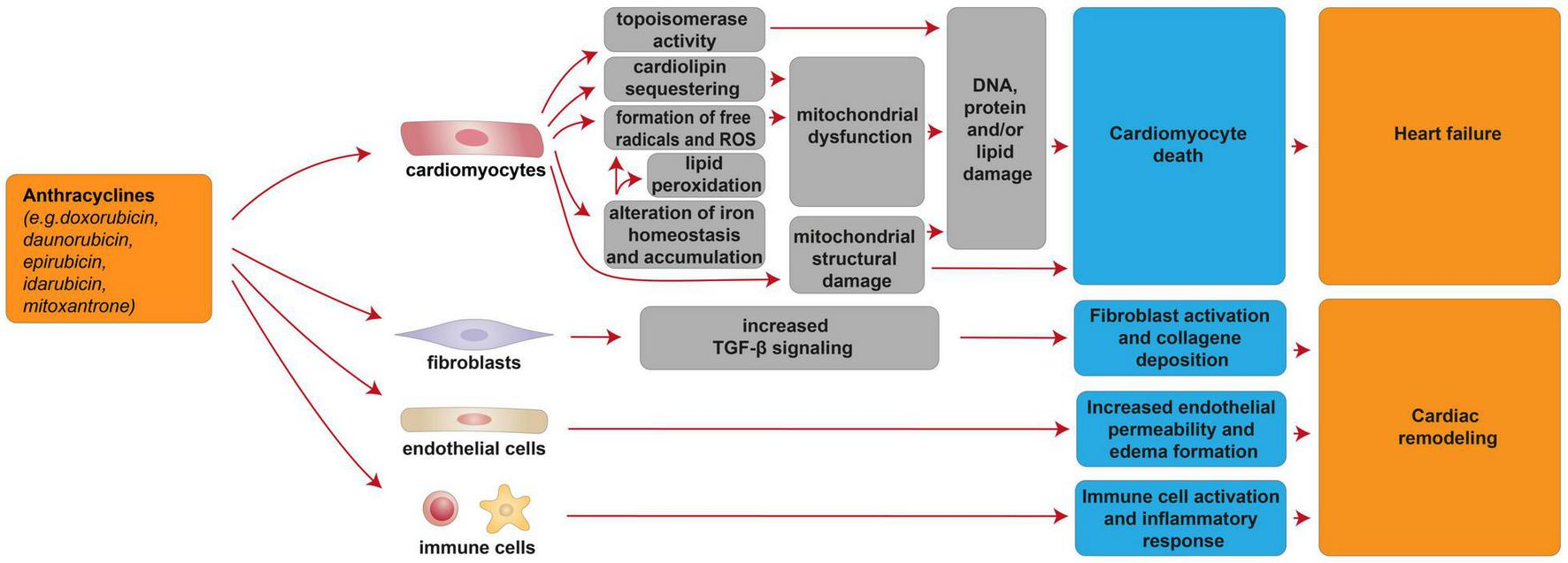 Cellular and molecular mechanisms of the cardiotoxic effects exerted by anthracyclines. Schematic diagram showing the impact of anthracyclines on a multitude of cardiomyocyte-intrinsic mechanisms leading to mitochondrial dysfunction and structural damage and/or DNA damage by topoisomerase activity, in turn leading to cardiomyocyte death and heart failure. Additional mechanisms of anthracycline-induced cardiotoxicity include deregulation of fibroblasts, endothelial, and immune cells, in turn concurring to cardiac remodeling.