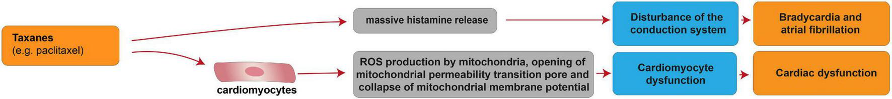 The underlying cellular and molecular mechanisms of taxane-induced cardiotoxicity are unclear; however, a few hypotheses have been proposed (Figure 3). Among them, hypersensitivity reaction with a massive histamine release and consequent disturbance of the conduction system and arrhythmia has been proposed (82). Hence, the administration of anti-inflammatory (glucocorticoids) and anti-histamine drugs (histamine receptor blockers), is suggested as prophylactic therapy for the management of cardiac anaphylaxis induced by taxanes [reviewed in (37, 88–90)]. Another hypothesis is cardiomyocyte damage through the drug’s actions on subcellular organelles (82). In this regard, taxanes were suggested to increase ROS production by cardiomyocyte mitochondria, the opening of mitochondrial permeability transition pore and the collapse of mitochondrial membrane potential (91).