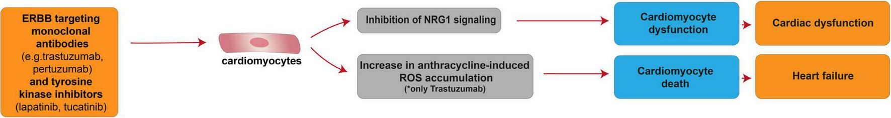 Cellular and molecular mechanisms of the cardiotoxic effect exerted by ERBB targeting monoclonal antibodies and tyrosine kinase inhibitors. Schematic diagram showing the impact of ERBB targeting therapies on cardiomyocyte dysfunction caused by the impairment of Neuregulin-1 signaling. However, in combination with anthracyclines, anti-HER2 monoclonal antibody trastuzumab may also induce heart failure as a consequence of cardiomyocyte death induced by ROS accumulation.