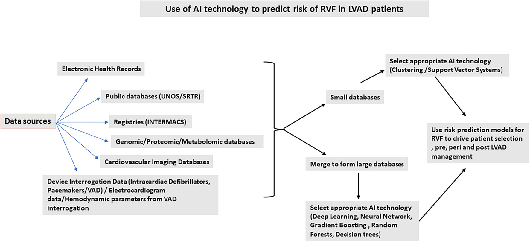 With increasing use of Mechanical Circulatory Support (MCS) in the last decade and its evolution currently as a standard therapy for patients with end stage heart failure (HF), it is becoming imperative to derive better risk prediction models to improve outcomes. The evolution of MCS and the transition from the older pulsatile-assist devices to the newer continuous flow pumps have ushered in an era of benefits for the HF with reduced ejection fraction population (1–8). However, challenges still persist in post implantation management in the long and short terms. Risk prediction models impact patient selection and, in turn, post-implantation outcomes. One of the most important factors influencing morbidity and mortality in the patients with left ventricular assist device (LVAD) is right ventricular failure (RVF). RVF can occur in ~10–40% of cases, depending on the definition used to describe such failure (3–8). Several risk prediction models exist in the current literature, which predict RVF in patients with LVAD (9–16). This article attempts to address the need for improved risk prediction models using artificial intelligence (AI) technology.
