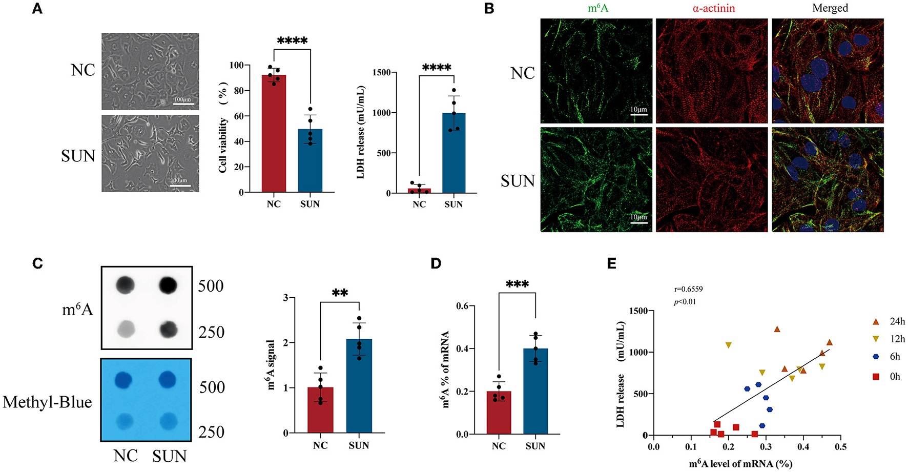 The global N6-methyladenosine (m6A) methylation level of sunitinib (SUN)-treated human-induced pluripotent stem cell-derived cardiomyocytes (hiPSC-CMs). (A) Representative images after SUN treatment for 24 h and measurement of lactate dehydrogenase (LDH) release level and cell viability are shown (n = 5). (B) The levels of m6A methylation in the normal control (NC) and SUN groups detected by m6A antibody-based immunofluorescence. Red denotes α-actinin, green denotes m6A, and blue denotes 4′,6-diamidino-2-phenylindole (DAPI). (C) The m6A level of total RNA of hiPSC-CMs is indicated by an m6A dot blot. Corresponding RNAs were loaded equally by a 2-fold serial dilution with 500 ng and 250 ng of methylene blue staining served as a loading control. (D) The RNA m6A level detected by the colorimetric method. (E) The m6A level of messenger RNA (mRNA) and the level of LDH release exhibit a time-dependent gradual increase after SUN treatment and the two indicators are positively correlated. “**” indicates p < 0.01, “***” indicates p < 0.001, and “****” indicates p < 0.0001.