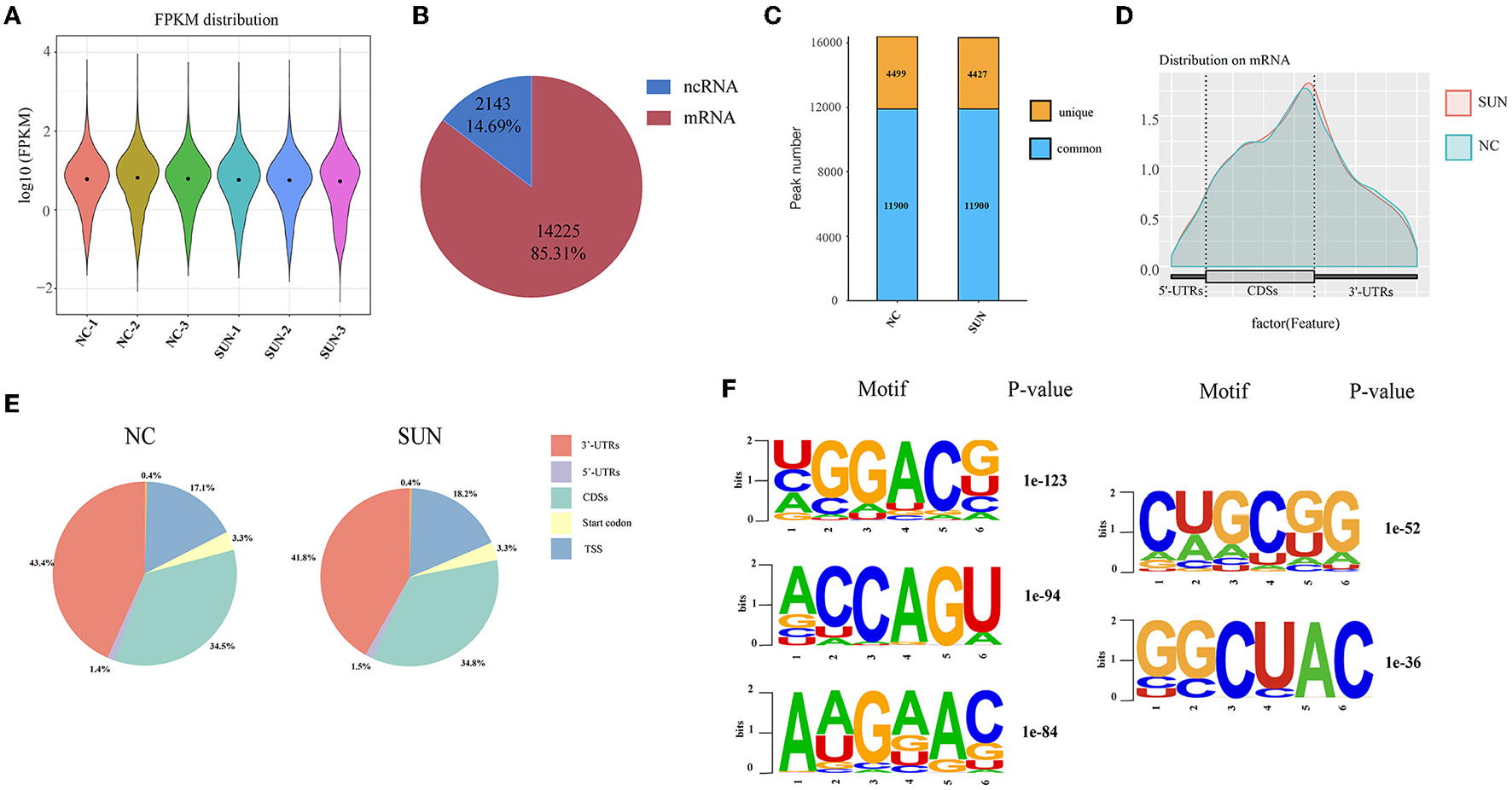 Overview of the m6A methylation map in SUN-treated hiPSC-CMs. (A) Sequencing sequences were compared to the genome and the distribution intensity and abundance of normalized expression quantities are described. (B) Pie chart showing the distribution of m6A peaks in mRNAs and non-coding RNAs (ncRNAs). (C) The histogram displays the unique and common m6A peaks in the two sets of mRNAs. (D) The density curve shows the distribution of the m6A peak on the transcript, which is divided into three parts: 5′-UTR, CDSs, and 3′-UTRs. (E) Pie charts showing the proportion of the m6A peak distribution in the NC and SUN groups. (F) The top five motifs enriched across the m6A peaks. SUN, sunitinib; CDS, coding DNA sequence; UTR, untranslated region.