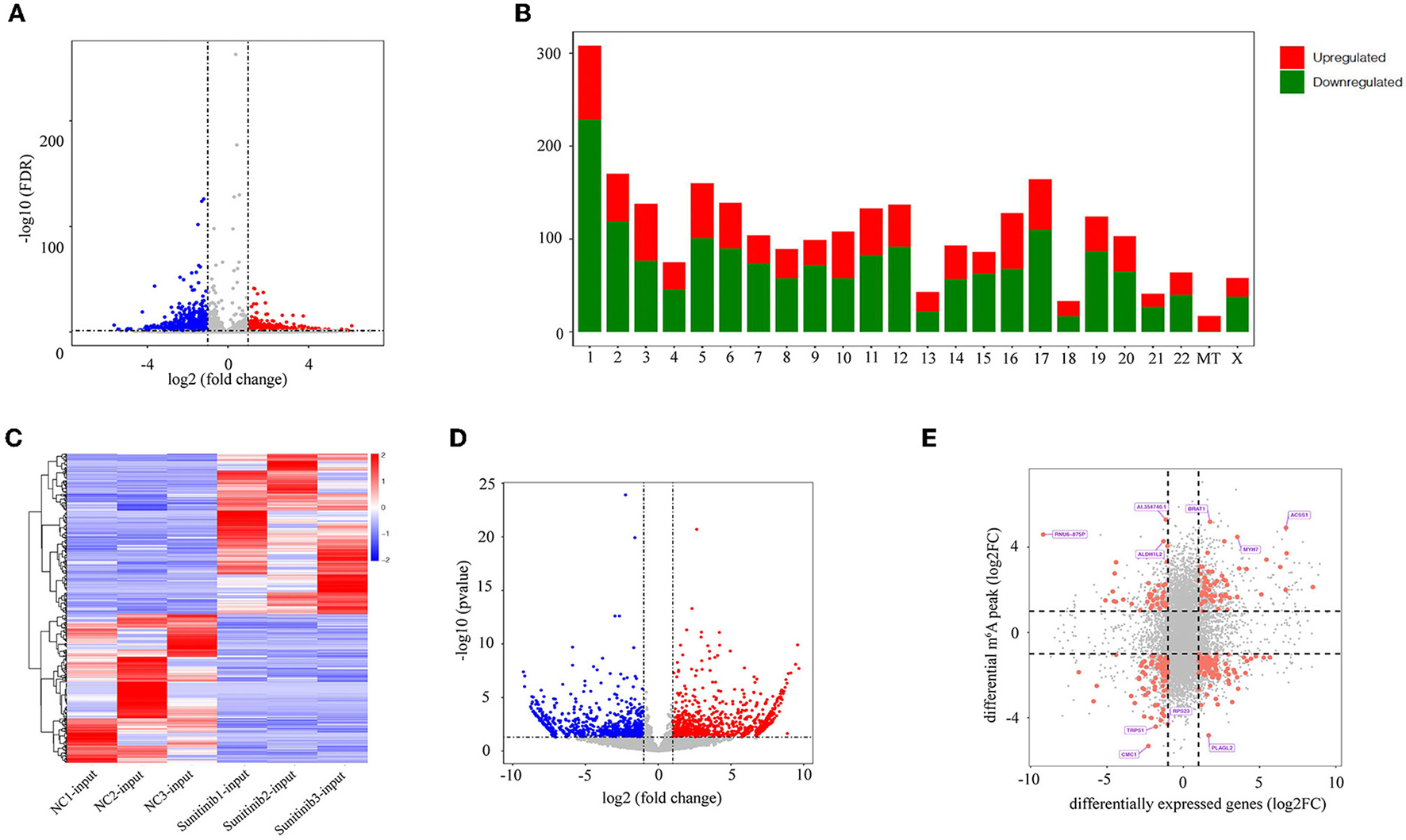 Joint analysis of methylated RNA immunoprecipitation sequencing (MeRIP-seq) and RNA sequencing (RNA-seq) data. (A) The volcano plot shows the difference in m6A methylation peaks, fold changes ≥2, and p-values < 0.05. The red image represents the high methylation peak of m6A and the blue image represents the low methylation peak of m6A. (B) The histogram shows the distribution of the m6A peak on chromosomes. (C) Heatmap showing upregulated and downregulated mRNAs. (D) The volcano map shows differentially expressed genes, p-value < 0.05, and double change ≥2. The red area represents upregulated genes and the blue area represents downregulated genes. (E) Four-quadrant diagram showing the relationship between mRNA m6A methylation and mRNA expression.
