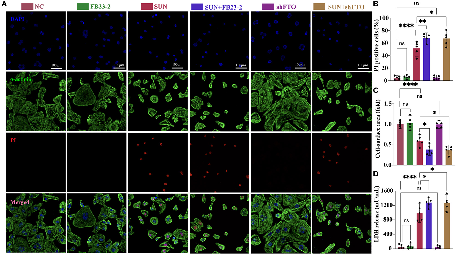 Our preliminary results showed that the half-maximal inhibitory concentration (IC50) of SUN treatment for 24 h (cell viability serving as the readout) is around 6 μM (Supplementary Figure S1A); thus, the subsequent experiments were carried out with 6 μM SUN (SU11248, Sellect, Shanghai, China) treatment for 24 h and equal volume of dimethyl sulfoxide (DMSO) treatment for 24 h served as the control group. For FTO Demethylase inhibitor (FB23-2) (S8837, Sellect, Shanghai, China) treatment, 20 μM FB23-2 was added simultaneously with SUN for 24 h. The concentration of FB23-2 was chosen based on a previous report (20).