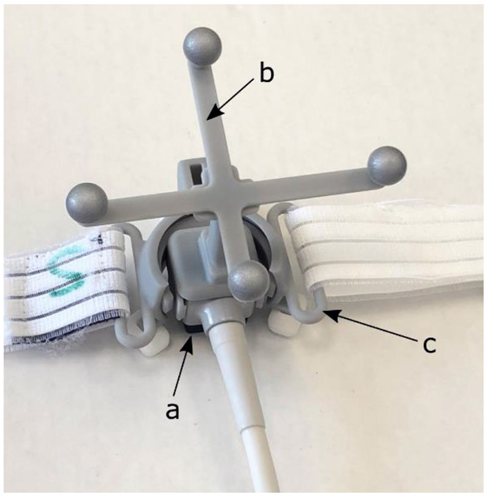 Prototype version of the EBAMed proprietary US probe system (a) equipped with an optical localization marker (b) and a probe holder with strap (c) that allows for fixation to the patient's chest.