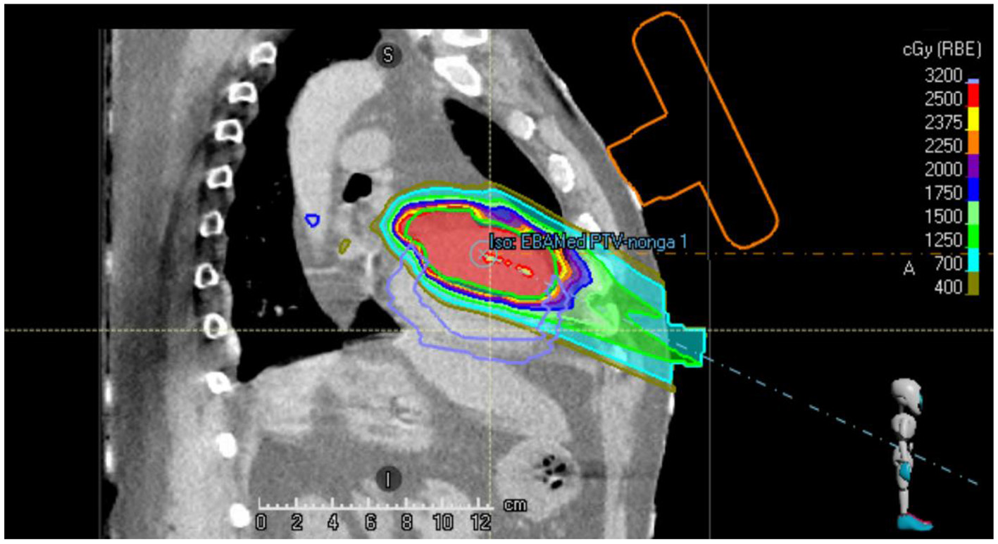 In literature several options to deal with the presence of an US probe during photon radiation treatment of oncological targets have been described (12, 17–19). To the best of our knowledge, none of the published works focused on dealing with a US probe during the irradiation of cardiac targets with protons. For this reason, this work presents a case report of a patient with ventricular tachycardia (VT) for whom a proton treatment planning study was performed. The aim of this treatment planning study was to design a clinically acceptable cardiac radioablation proton treatment plan for a real VT target.