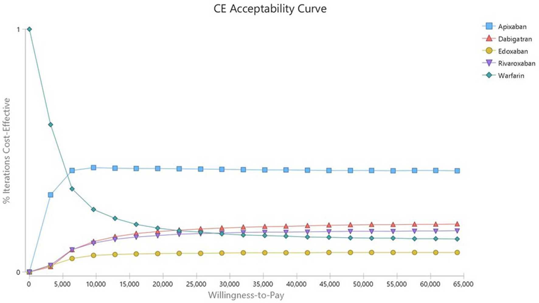 The total cost of warfarin, rivaroxaban, apixaban, dabigatran and edoxaban was $2,874, $5,761, $5,151, $5,761 and $5,851, respectively. The QALYs gained were 10.83, 10.95, 11.10, 10.49 and 10.99 years, respectively. The incremental cost-effectiveness ratio of rivaroxaban, apixaban, dabigatran and edoxaban was $29,743.99, $8,426.71, -$8,483.04 and $18,483.55, respectively. The WTP was set at $32,000. DOACs (except dabigatran) were more cost-effective compared with warfarin because they did not exceed the WTP in the base-case analysis.