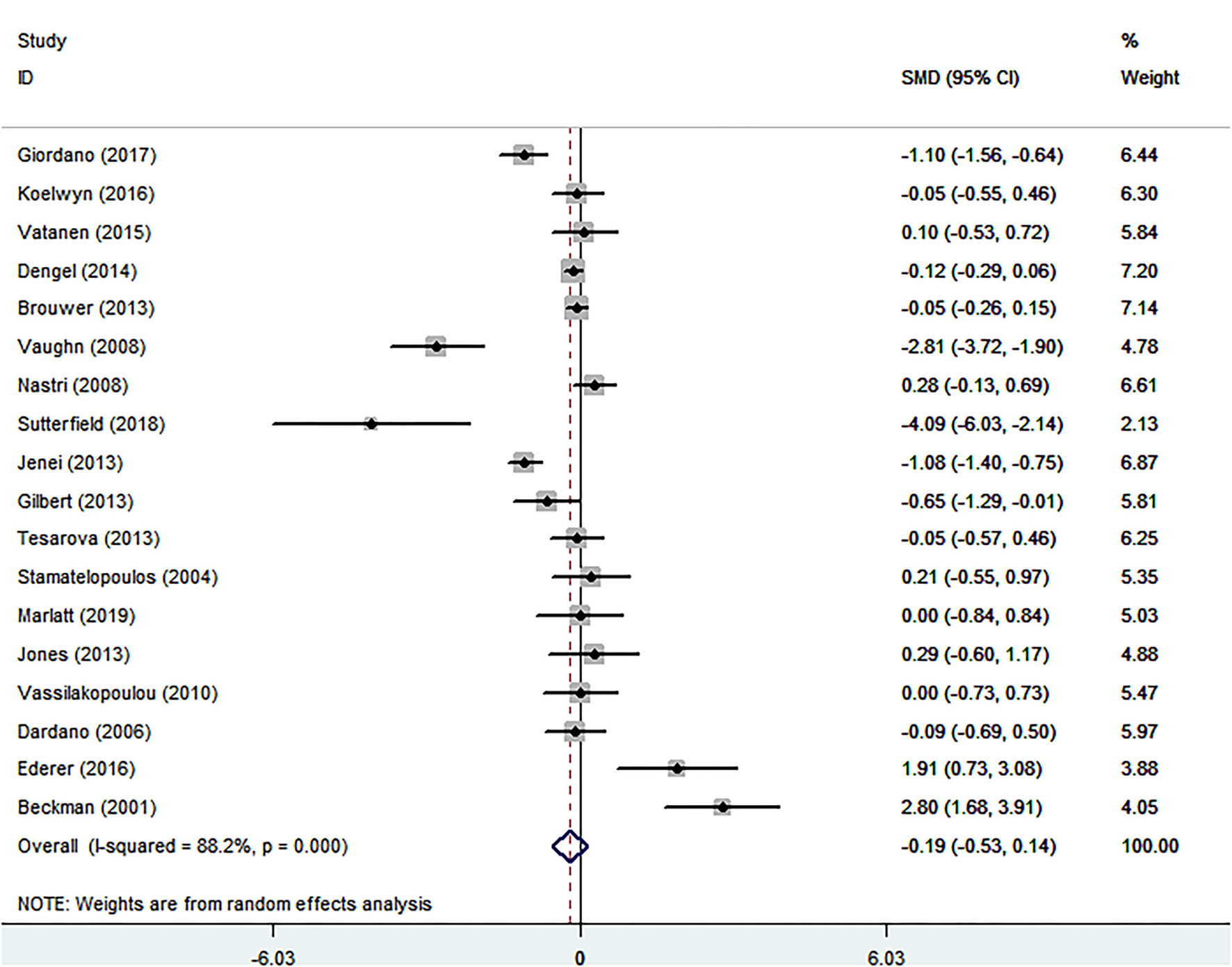 Eighteen eligible studies were finally identified, involving 1,074 cancer patients and 672 healthy controls.The SMD of −0.192 (95% CI = −0.527 to 0.144, P = 0.263) was no significance (Table 1; Figure 4). The I2 statistic was 88.2%. In terms of sub-group analyses, there was a lower FMD in the following subgroups: age <50 years [SMD (95% CI) = −0.520 (−0.915, −0.125), P = 0.010], male ratio ≥ 50% [SMD (95% CI) = −0.797(−1.351, −0.242), p = 0.005], and chemotherapy group [SMD (95% CI) = −0.853 (−1.682, −0.023), P = 0.044] (Table 1). The Begg test (P = 0.743) and Egger test (P = 0.501) was no obvious publication bias (Table 2). There was no significant change in the SMD (95%CI) by taking out studies one by one (Supplementary MaterialsSupplementary Table S7). Analysis of subgroup, analysis of sensitivity, and meta-regression (Supplementary MaterialsSupplementary Table S8) failed to explain the cause of meaningless.