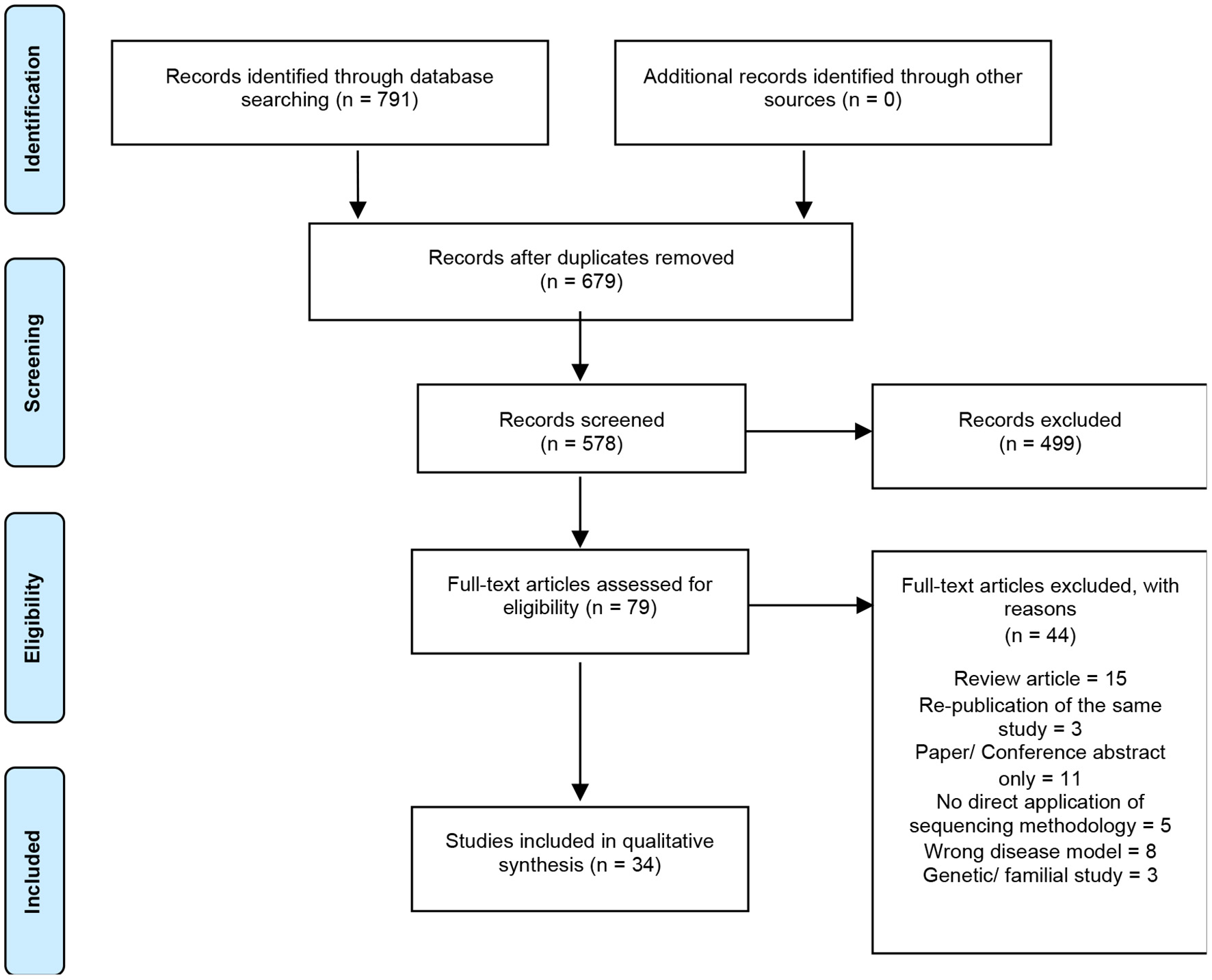 A total of 791 articles were identified by the search strategy, 679 following the removal of duplicates, which were then screened against the inclusion/exclusion criteria. Of these papers, only 34 were eligible for final synthesis (Figure 1). A summary of the characteristics of all included studies are reported in Table 1.