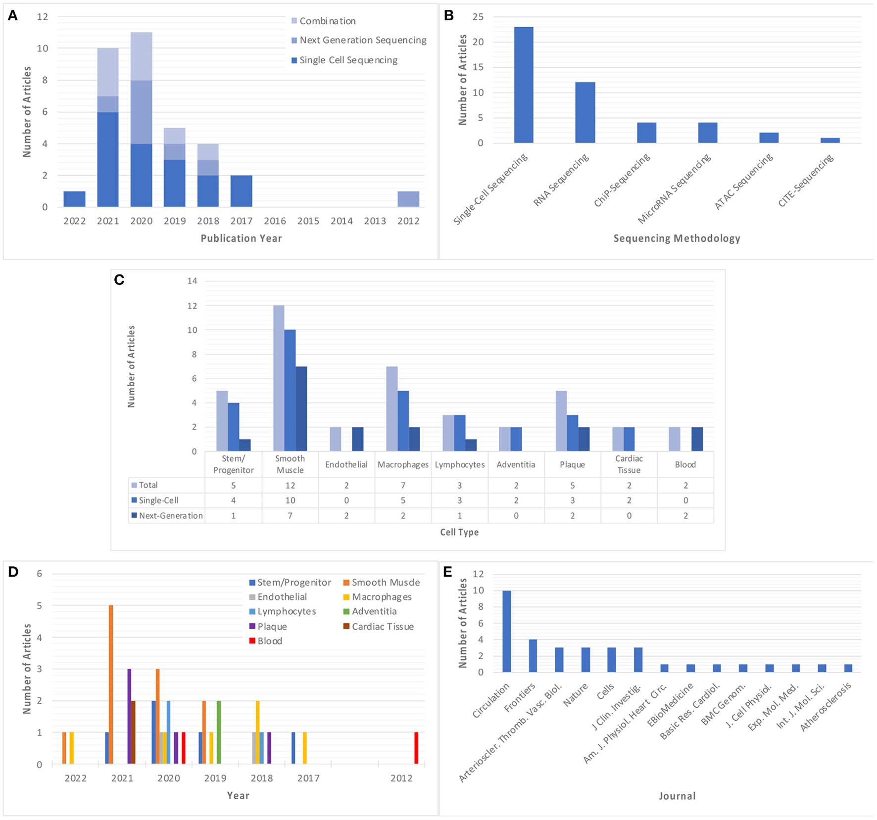 Studies using single-cell and/or next-generation sequencing to explore atherosclerosis and/or vascular inflammation appeared as early as 2012, however, there was an upsurge in the prevalence of these studies starting in 2017 (Figure 2A). The most employed sequencing methodology in these studies is single-cell sequencing (n = 23), which was first utilized in 2017 and features more frequently in subsequent years. Comparatively, next-generation sequencing was utilized less frequently (n = 12), with no significant trend in its use over time. A total of 10 articles utilized a combination of sequencing methods, with some articles using chromatin immunoprecipitation sequencing (ChIP-Seq) (n = 4), microRNA sequencing (n = 4), assay for transposase-accessible chromatin sequencing (ATAC-Seq) (n = 2) and cellular indexing of transcriptomes and epitopes sequencing (CITE-Seq) (n = 1) (Figure 2B). The most commonly studies cell types were smooth muscle cells (SMCs) (n = 10), followed by macrophages (n = 6) and stem/progenitor cells (n = 5), although these techniques are also applied more broadly to investigate the cellular and molecular characteristics of tissue, atherosclerotic plaque, and blood samples (Figure 2C). Interestingly, there appears to be a trend in the types of cells studied over time, with focus on smooth muscle cells almost tripling in prevalence from 2019 (n = 2) to 2021 (n = 5), whilst focus on macrophages has been consistent for a longer period (2017–2022), but at a lower prevalence (Figure 2D). All included studies were published in journals with impact factor ≥4, with the vast majority appearing in the publications Circulation and Circulation Research (n = 10) (Figure 2E).