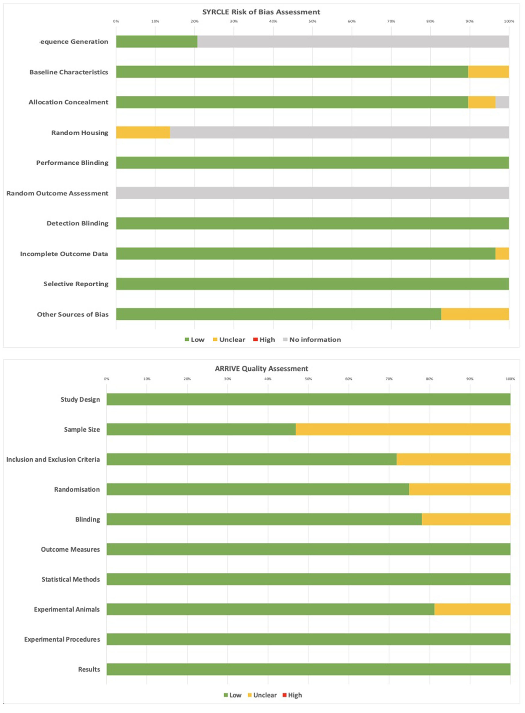 Quality of included studies was assessed using the ARRIVE guidelines checklist (16). For assessment of the risk of bias, SYRCLE, a modified version of the Cochrane Risk of Bias tool specifically for animal intervention studies, was utilized (17). Following data extraction, author L.W.M. performed quality and risk of bias assessment. Any discrepancies were resolved by discussion between all authors.