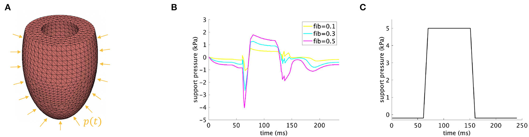 (A) Discretized model of the rat LV with applied support pressure p(t) on the epicardial surface. (B) Time-dependent support pressure according to Equation (8) for fib∈{0.1, 0.3, 0.5}. (C) Time-dependent support pressure according to Equation (9).