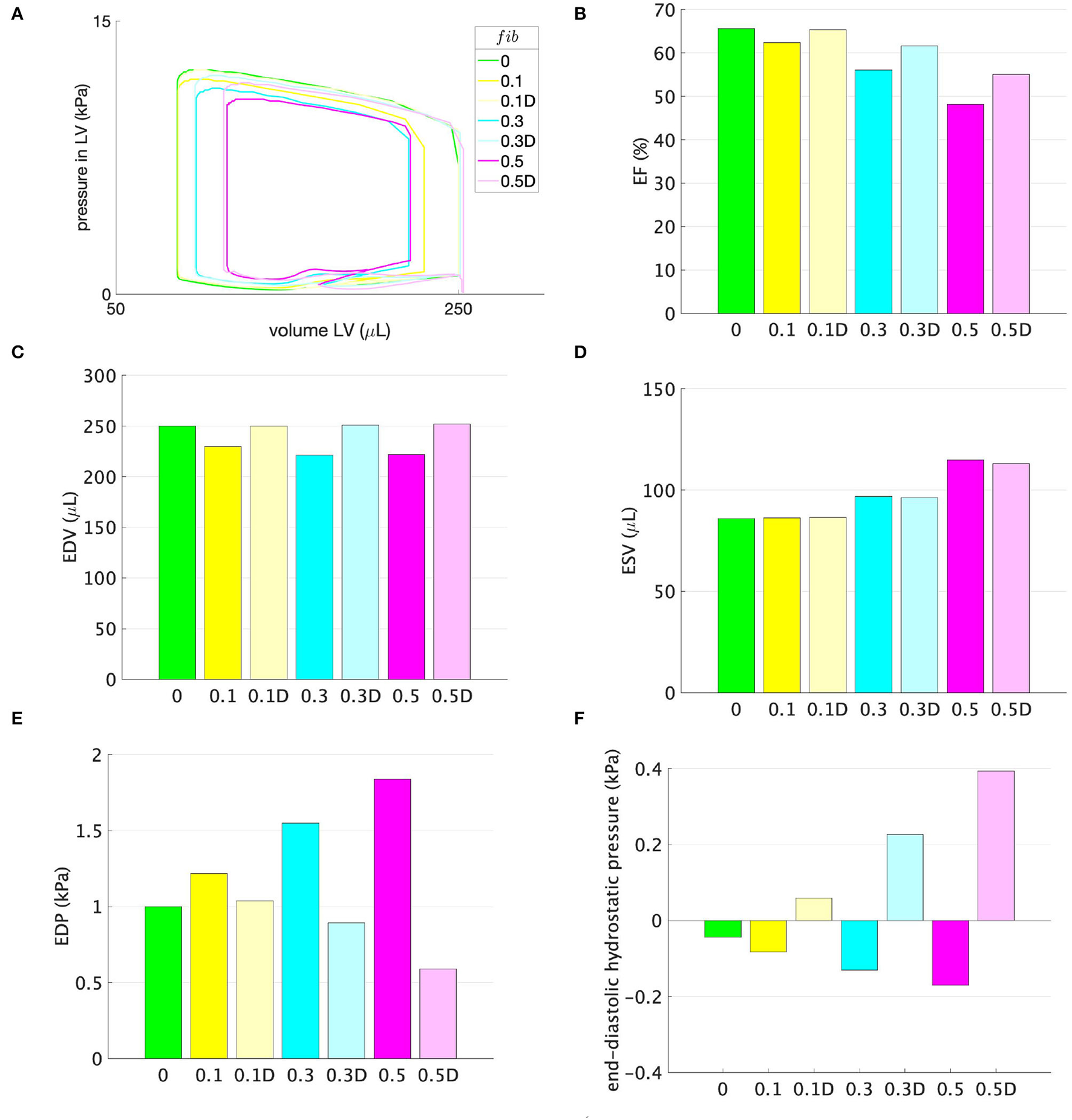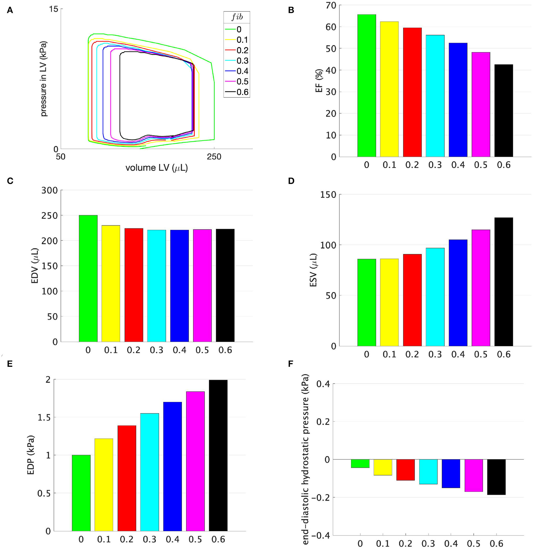 (A) Pressure-volume loops, (B) ejection fraction (EF), (C) EDV, (D) ESV, (E) EDP, and (F) end-diastolic hydrostatic stress for models with different amounts of fibrosis fib displayed on the horizontal axis. No support pressure is applied.