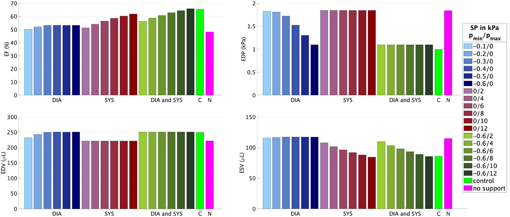 Ejection fraction, EDP, EDV, and ESV for different combinations of the minimal pmin and maximal pmax values of the support pressure (SP) applied to the epicardial surface of the model with fib = 0.5. DIA, diastolic support (blue); SYS, systolic support (red); DIA and SYS, combined support (green); C, control rat LV (light green); N, rat LV with fib = 0.5 without any support (pink).