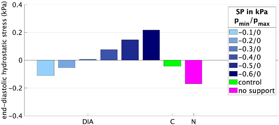 End-diastolic hydrostatic stress for different support pressures (SPs) applied to the rat LV with fib = 0.5. DIA, diastolic support; C, control rat LV; N, rat LV with fib = 0.5 without any support.