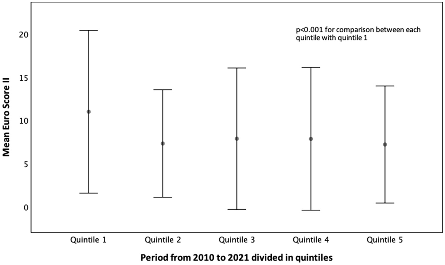 Continuous variables were presented as mean ± SD and were compared by the Student's t-test for variables that showed normal distribution. The Kruskal–Wallis test was used for the comparison of continuous variables that did not show normal distribution. Differences in proportions were compared by the χ2 test or Fischer's exact test as appropriate. All patients were divided into quintiles to determine possible differences in the demographic and clinical characteristics and short-term outcomes of patients over the last 10 years. Continuous variables in quintiles were compared by the ANOVA, as they showed normal distribution using the Kolmogorov–Smirnov test. Troponin T and N-terminal prohormone of brain natriuretic peptide (NT-pro-BNP) did not initially show normal distribution. Therefore, a logarithmic transformation was performed. Tukey's Honestly Significant Difference (HSD) post-hoc analysis was used for the comparison between different quintiles. The p-value <0.05 was considered statistically significant.