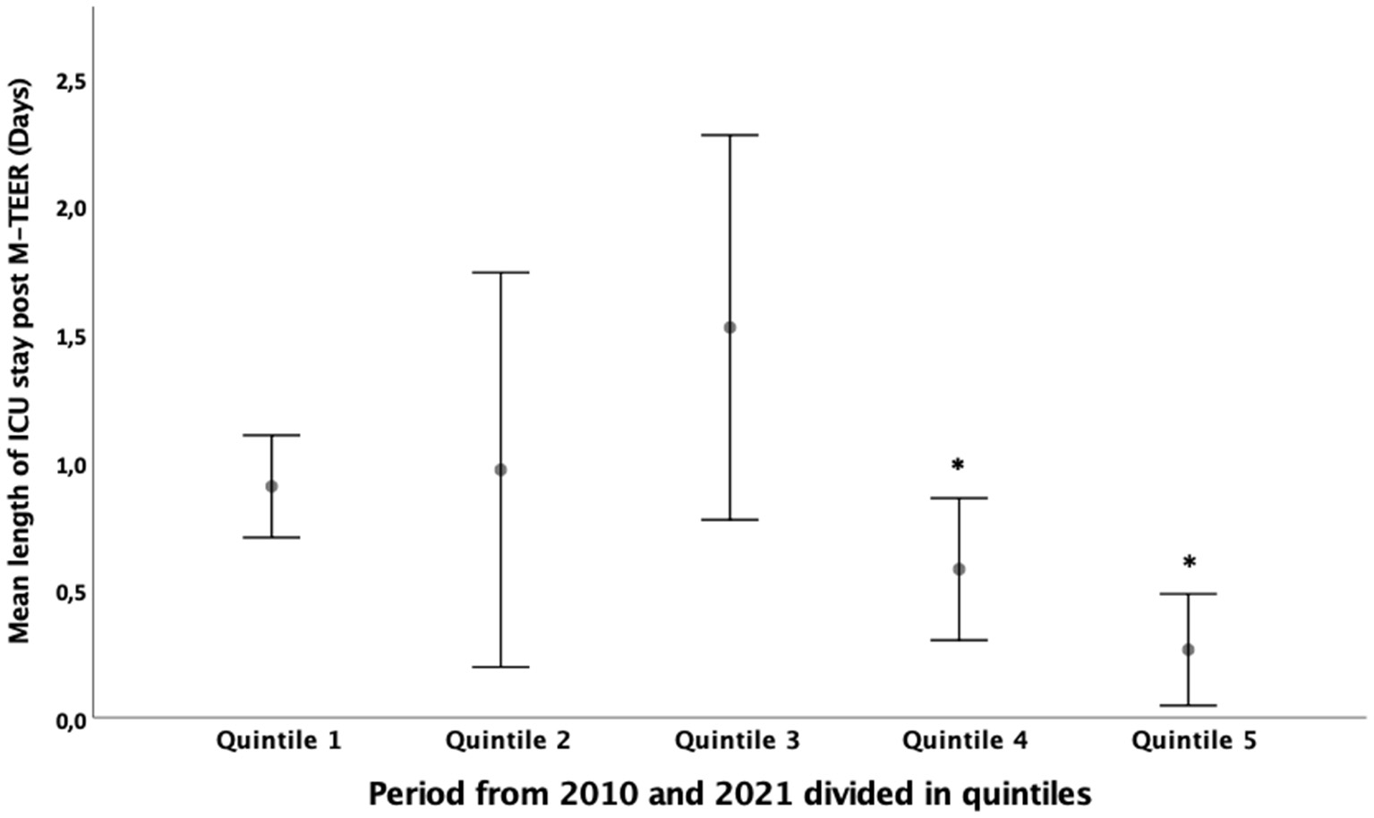 Our experience significantly influenced fluoroscopy time and hospitalization duration, which significantly decreased in the last quintile compared with the first quintile (Table 4). The reduction in hospitalization before and after M-TEER is particularly important during the COVID-19 era, which showed how the availability of hospital beds might be an important limitating factor for all non-elective interventional procedures in cardiology. Nevertheless, the short-term outcomes (intrahospital mortality, 30-day hospitalization, MACE, and mortality) did not significantly change between patients who were treated at the beginning of M-TEER and those who were treated more recently (Table 4).