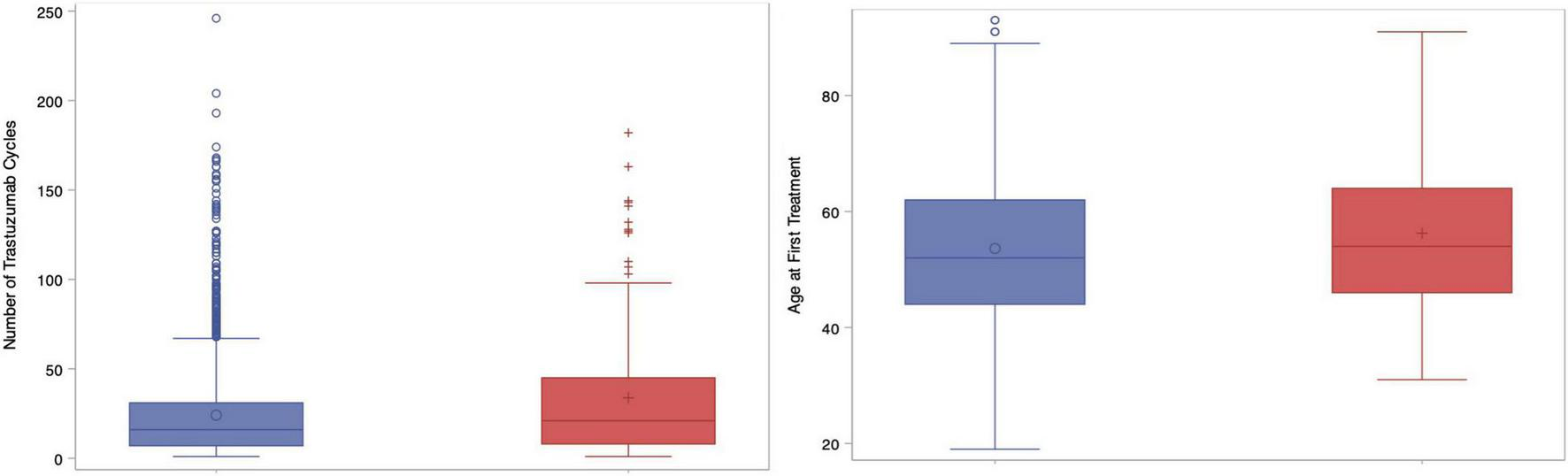 For the primary endpoint, the incidence of CEs was 7.3% (n = 167) in what will herein be referred to as group A, whereas 92.3% (n = 2117) did not have any CEs (group B). Table 1 contains baseline characteristics for both the study population overall as well as each study group individually. Heart failure was observed in 6.9% (n = 158) of the study population, representing 94.6% (158/167) of the CEs. Less than 1% of patients died of cardiac causes (n = 12, 0.5%) while 34.1% (n = 779) died of their cancer, and 14.8% died for other reasons (n = 339). Group A had an older median age of 61 (IQR 51–70) vs. 57 (48–66) in group B, p < 0.01. Patients in group A also received a greater number of trastuzumab cycles, 21.0 (IQR 8–45) vs. 16.0 (IQR 7–31), p < 0.01. Figure 1 contains boxplots showing the distribution of age and trastuzumab cycles in groups A and B. The remaining baseline characteristics were well-balanced between groups A and B with no significant differences found for neighborhood income quintiles, pertuzumab use, prior anthracycline use, prior trastuzumab use, cancer related deaths, baseline Charlson co-morbidity index, estrogen receptor status, progesterone receptor status, or initial stage at diagnosis (I-III vs. IV). In total, the Charlson index was 0 in 28.2% (n = 644), 1–2 in 10.7% (n = 244) and ≥3 in 50.9% (1,163).