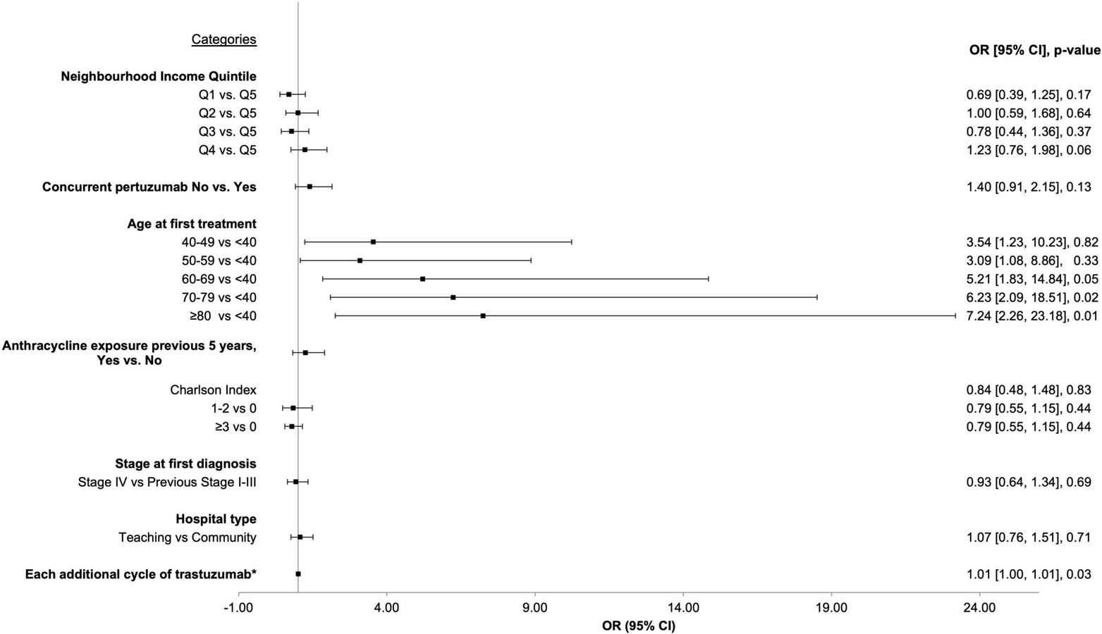 This retrospective population-based cohort study included aBC patients treated with trastuzumab (all lines), in Ontario, Canada from 2007 to 2017. The overall cohort was divided into two groups; those who developed a cardiac event (CE) vs. those who did not. Patients with pre-existing heart disease were excluded. Logistic regression was performed to identify patient characteristics associated with an increased risk of CE.