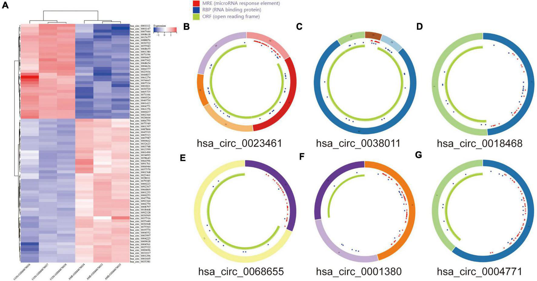 DEcircRNAs in GES160717. (A) Heatmap of DEcircRNAs in GSE160717. (B) Structural pattern of hsa_circ_0023461. (C) Structural pattern of hsa_circ_0038011. (D) Structural pattern of hsa_circ_0018468. (E) Structural pattern of hsa_circ_0068655. (F) Structural pattern of hsa_circ_0001380. (G) Structural pattern of hsa_circ_0004771.
