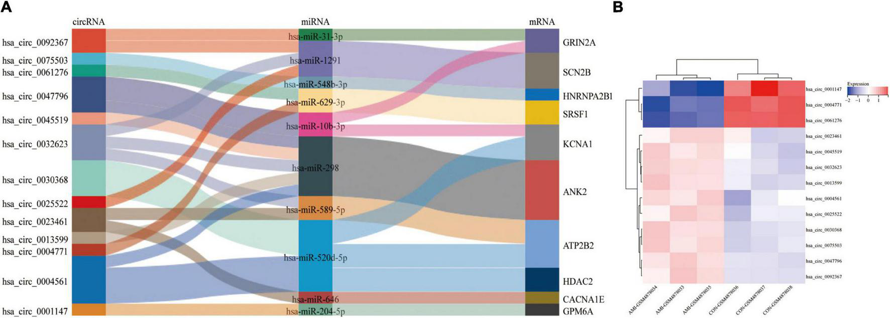 Based on hub genes identified in PPI network, corresponding miRNAs and circRNAs were selected from circRNA-miRNA-mRNA regulatory networks mentioned above. R software ggplot2, ggalluvial, and dplyr package was used to draw sankey diagrams (32). The heat map of circRNAs in this sankey diagram were produced using the package gg plots of R software (version: x64 3.2.1).