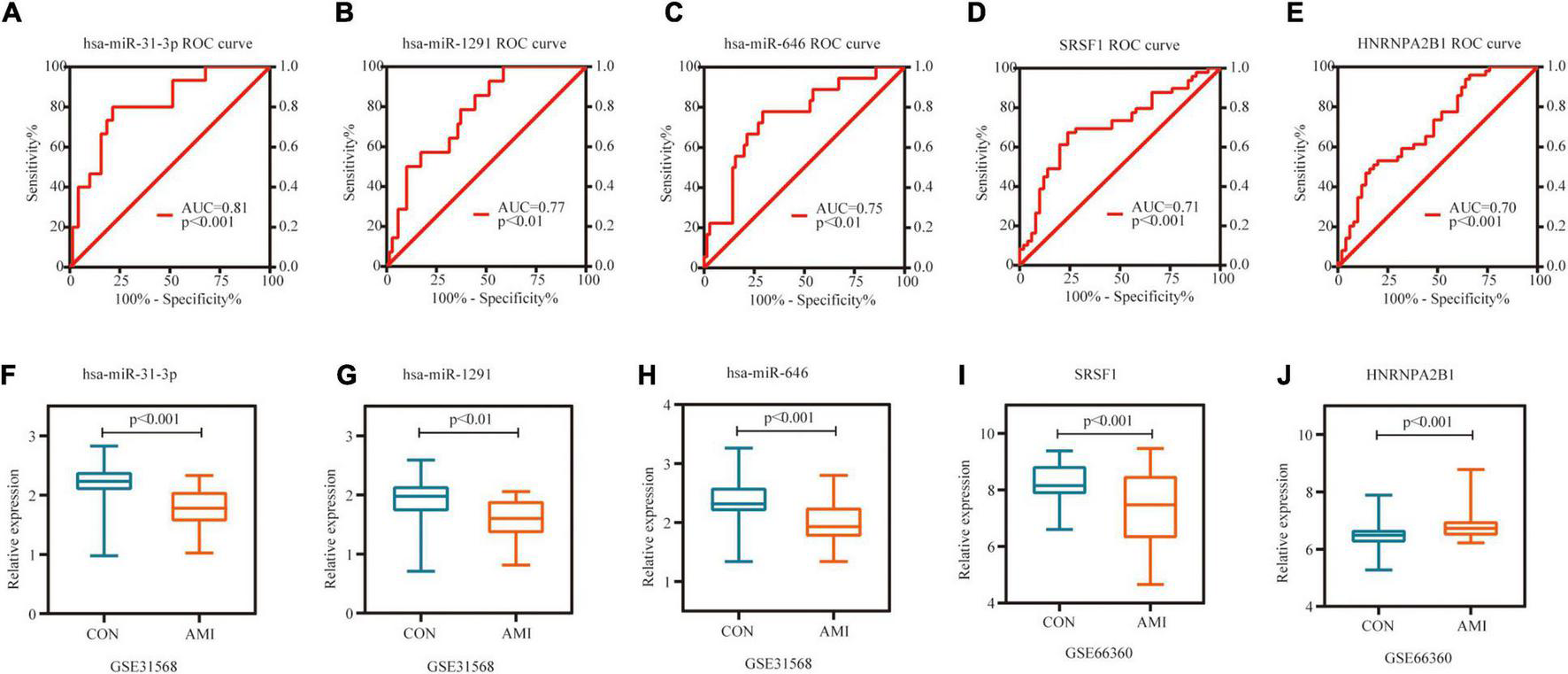 Hub gene and hub gene-related miRNAs in the sankey diagram were considered as candidate biomarkers for AMI. Based on their raw expression data in datasets GSE31568 (miRNA), GSE61741 (miRNA), GSE24519 (mRNA), and GSE66360 (mRNA), Graphpad Prism (version:8.0) software was used to plot the receiver operator characteristic curves and calculate the area under the curve (AUC) respectively to evaluate the predictive ability of these biomarkers for AMI. Meanwhile, hub genes and miRNAs with AUC ≥ 7.0 and P < 0.05 were screened as potential biomarkers. Their relative expression levels in these datasets were further evaluated by box plots. Graphpad Prism 9 software was used for analysis and mapping to compare the control and AMI groups. Comparison between the two groups was performed by independent sample T test. P < 0.05 was considered statistically significant.