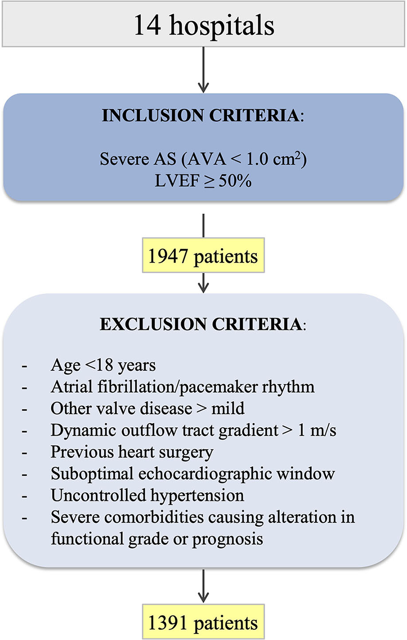 A retrospective longitudinal observational study was conducted of consecutive patients from 14 tertiary hospitals nationwide diagnosed between 2008 and 2016 with severe AS (aortic valve area (AVA) < 1.0 cm2) with left ventricular ejection fraction (LVEF) ≥ 50% on the transthoracic ECG (Figure 1). Exclusion criteria were: age < 18 years, atrial fibrillation or pacemaker rhythm, aortic regurgitation more than mild, other valvular heart disease more than mild, left ventricular outflow tract dynamic gradient exceeding a velocity >1 m/s, previous heart surgery, suboptimal echocardiographic window, poor blood pressure control, and comorbidities at baseline that could themselves cause an alteration in functional grade or prognosis (e.g., severe chronic obstructive pulmonary disease [COPD]).