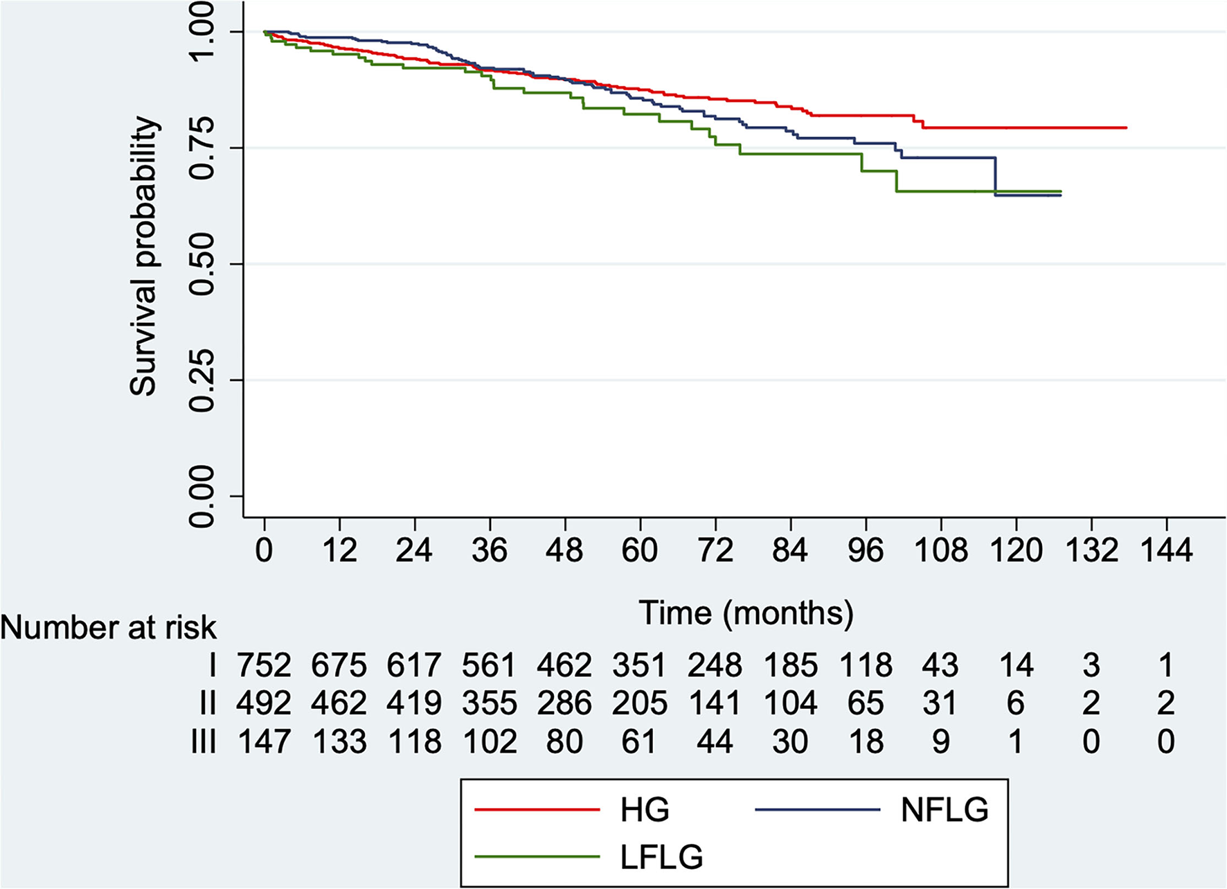 Death from cardiovascular cause occurred in 195 cases (14%, CI 95% 12.2–16.0) representing a 50.6% of overall mortality: 28 patients with LFLG (19%, CI 95% 13.0–26.3; median time: 50.9 months, ICR: 32.0–75.9), 95 patients with HG (12.6%, CI 10.3–15.2; median time: 56.1 months, ICR: 33.8–83.7), and 72 patients with NFLG (14.6%, CI 95% 11.6–18.1; median time: 52.5 months, ICR: 29.0–76.9), with no significant differences among groups (Figure 4, log-rank p = 0.061).