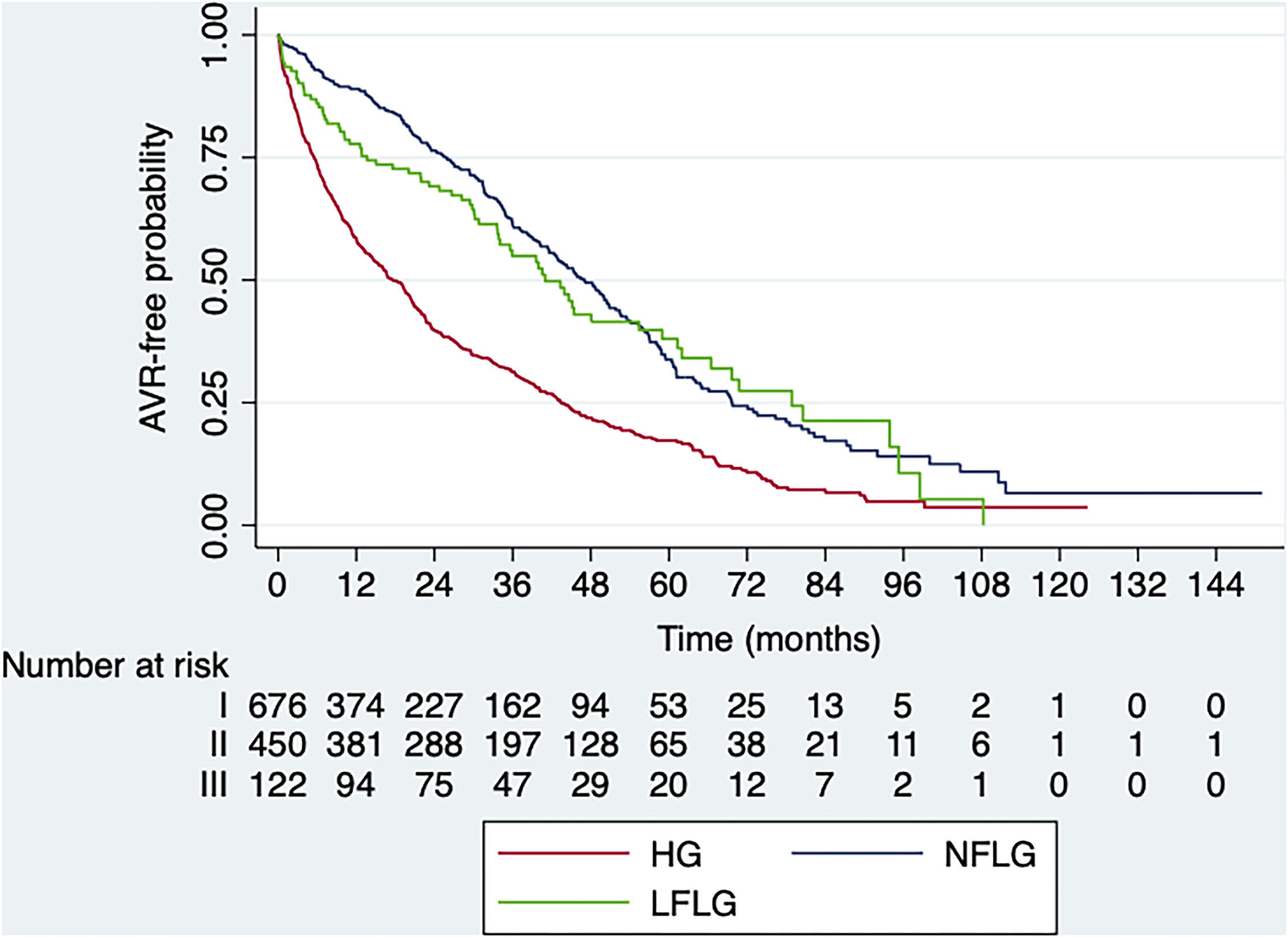 Kaplan–Meier aortic valve replacement (AVR)-free survival curves according to AS subtype at baseline. HG, high-gradient; LFLG, low-flow low-gradient; NFLG, normal-flow low-gradient (log-rank p < 0.001).