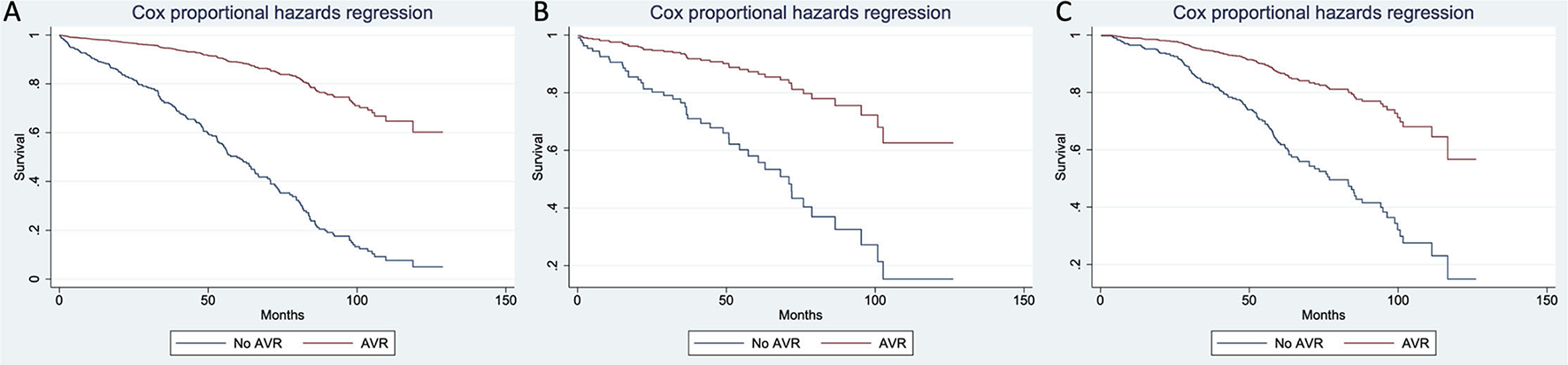 Cox survival curves for overall mortality in the population with severe AS according to AVR and AS subtype [(A): HG; (B): LFLG; (C): NFLG)]. AVR, aortic valve replacement.