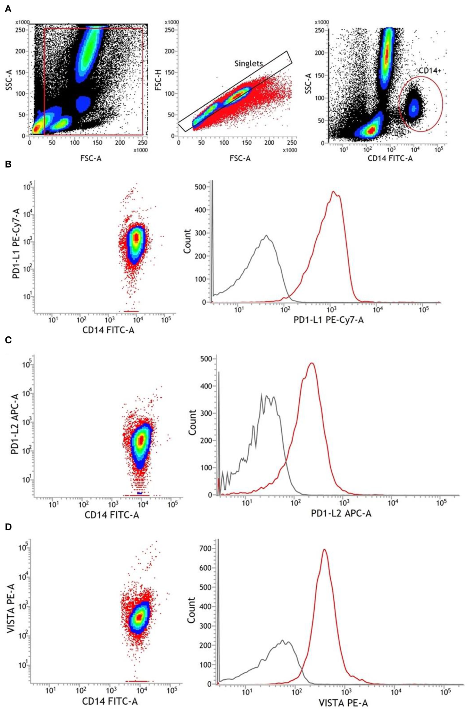 Representative gating strategy for monocytes and antibody staining of surface markers. (A) Chronological from left to right: debris were excluded from all cellular events. Afterward, single cells were identified via FSC-A and FSC-H. Using CD14 FITC antibodies, monocytes were finally detected as CD14+. (B–D) Antibody staining of PD-L1, PD-L2, and VISTA in CD14+ monocytes. The gray line represents FMO, and the red line represents stained monocytes. APC, allophycocyanin; FMO, fluorescence minus one; FSC-A, forward scatter area; FSC-H, forward scatter height; PE, phycoerythrin; SSC-A, side scatter area.