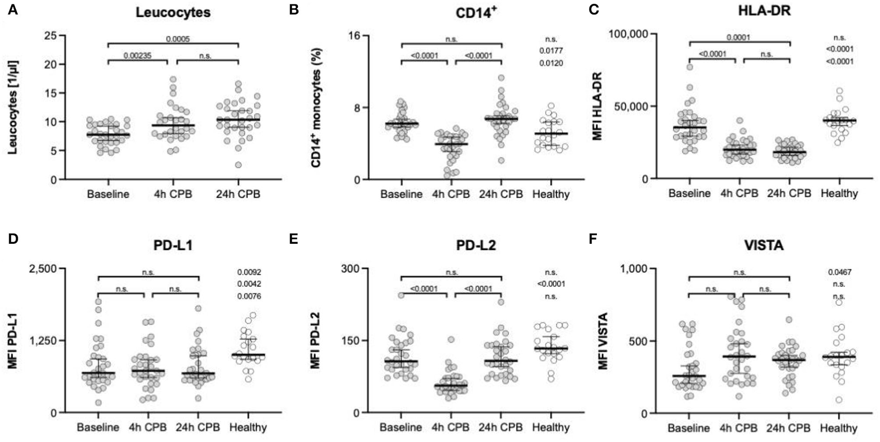Leukocytes, CD14+ monocytes, and surface markers HLA-DR, PD-L1, PD-L2, and VISTA. Leukocyte count of patients (A) and the percentage of CD14+ monocytes (B) in full blood; FACS analyses of surface marker: (C) expression of HLA-DR on isolated blood monocytes; (D) expression of PD-L1 on isolated blood monocytes; (E) expression of PD-L2 on isolated blood monocytes; (F) expression of VISTA on isolated blood monocytes; all measurements in (C–F) were taken from isolated blood monocytes before surgery (baseline), 4 h after CPB (4 h CPB), 24 h after CPB (24 h CPB), and compared to the healthy control group; data shown as median and the whiskers of the 5th and 95th percentile; MWU test was used to test for significance; CPB, cardiopulmonary bypass; FACS, fluorescence-activated cell sorting; HLA, human leukocyte antigen system; ΔMFI, delta mean fluorescence intensity; PD-L, programmed cell death ligand; VISTA, V-domain Ig suppressor of T-cell activation.