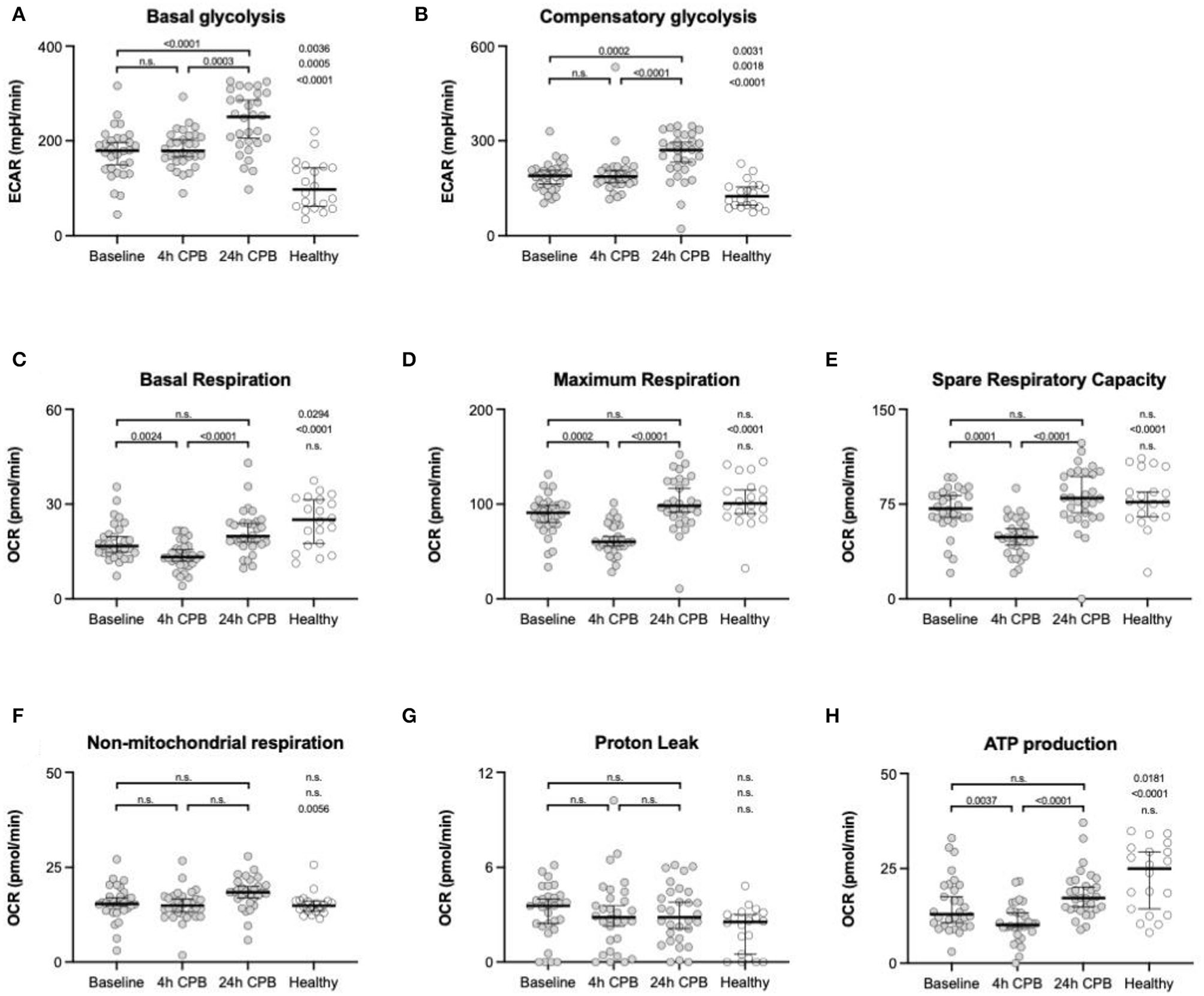 ATP production in healthy individuals was significantly higher than in patients (24.97 vs. 12.05 pmol/min; p = 0.0181) (Table 2, Figure 3H). ATP production during cardiac surgery decreased (t0 12.05 pmol/min to t4 10.13 pmol/min; p = 0.0024) and thereafter increased again to 17.26 pmol/min after 24 h. The basal glycolysis of healthy individuals was lower than in patients (97.4 vs. 179.2 pmol/min; p = 0.0035). It rose from baseline to t24 from 179.2 pmol/min to 250.1 pmol/min (p < 0.0001) (Table 2, Figure 3A). The compensatory glycolysis was elevated in patients undergoing cardiac surgery compared with healthy individuals (189.1 vs. 124.8 pmol/min; p = 0.0031) and increased 24 h after CPB to 270.9 pmol/min (p = 0.0024) (Table 2, Figures 3A,B). Maximum respiration (90.98 vs 60.03 pmol/min, p = 0.0002) and spare respiratory capacity (71.43 vs 48.64 pmol/min, p = 0.0001) had a transient dip 4 h after CPB (Table 2, Figures 3D,E). Proton leak and non-mitochondrial respiration showed no signifikant changes during surgery (Table 2, Figures 3F,G).