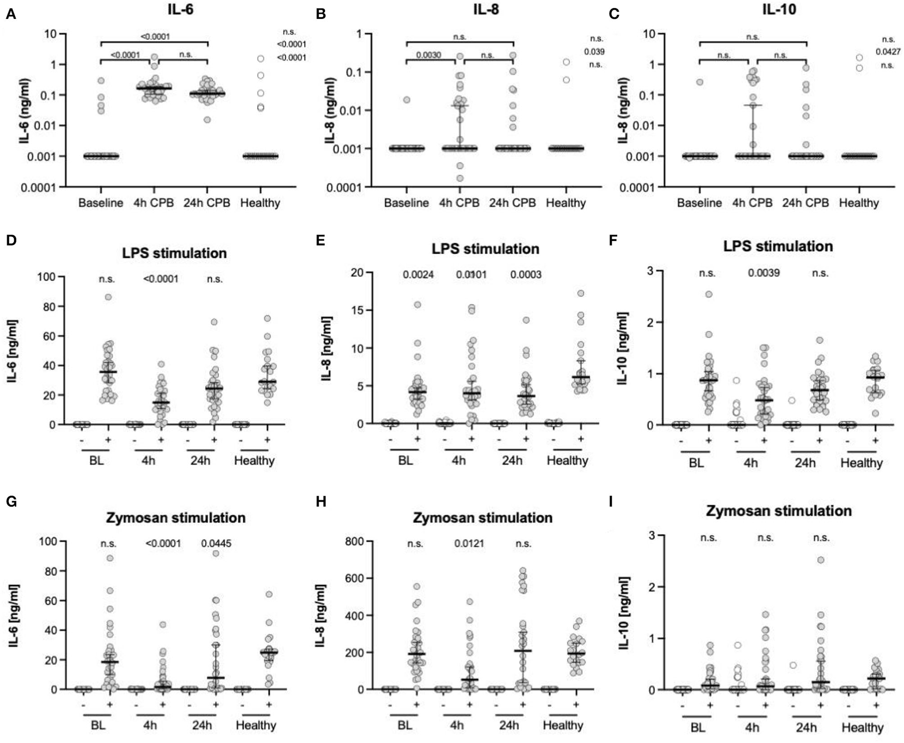 The ex vivo stimulation was conducted in a 96-well TC plate (Sarstedt, Nümbrecht, Germany). Six wells were each filled with 150 μl heparinized blood and 150 μl prewarmed medium (RPMI 1640 Medium, GlutaMAX™ Supplement, HEPES; Thermo Fisher Scientific, Waltham, USA). The first two control wells were not stimulated. The third and fourth were each stimulated with 100 ng/ml ultrapure lipopolysaccharide (LPS). The last two wells were exposed to 100 μg/ml depleted zymosan. The whole plate was stored in a CO2 incubator (5% CO2, 37°C). After 24 h, the plate was centrifuged (5 min at 1,200 × g, RT) to obtain supernatant for further cytokine analyses.