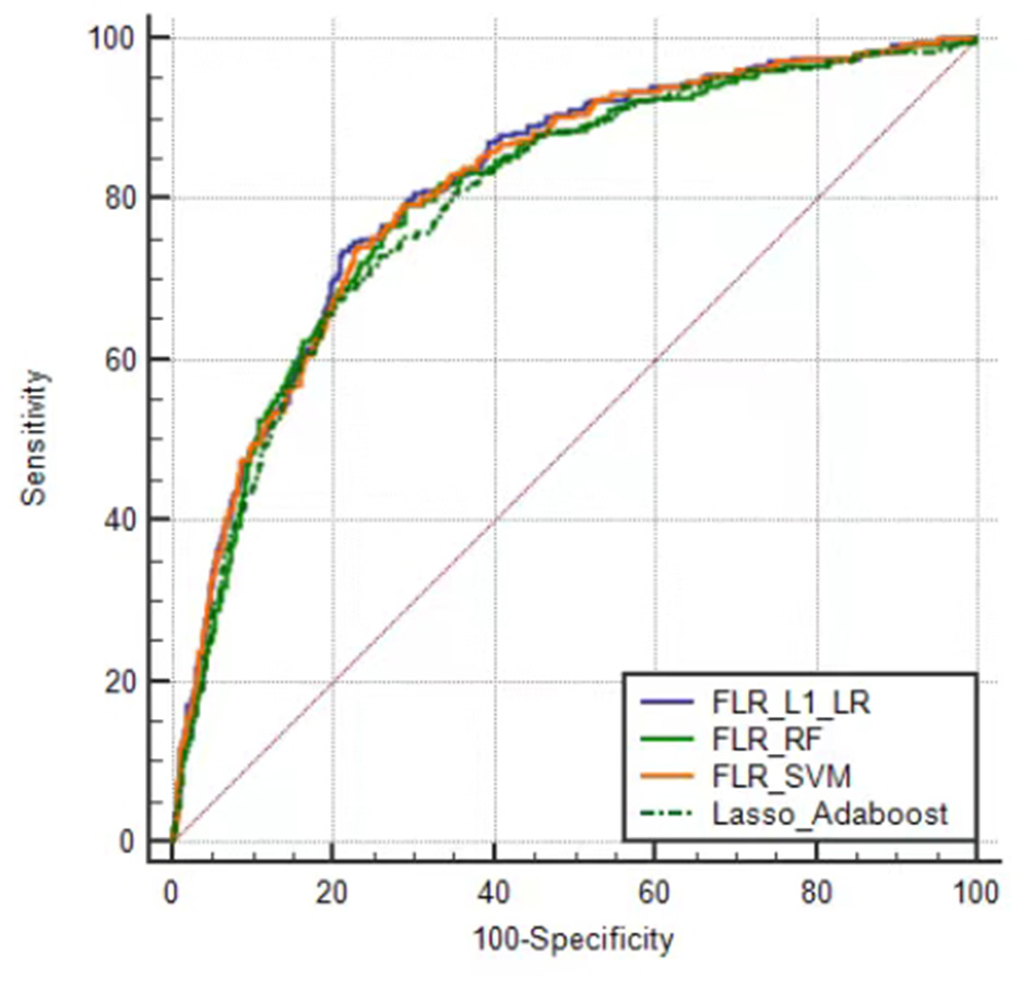 The predictive performance indicators of the optimal models for each algorithm are listed in Table 1. All models have a moderate or higher (AUC value between 0.798 and 0.817) distinguishing ability. The AUC of FLR-L1-LR, FLR-SVM, FLR-RF, and Lasso-AdaBoost was 0.817 (95% CI, 0.801–0.832), 0.814 (95% CI, 0.798–0.829), 0.804 (95% CI, 0.788–0.820), and 0.798 (95% CI, 0.782–0.81), respectively. The receiver operating characteristic (ROC) curve of the prediction model is shown in Figure 1.
