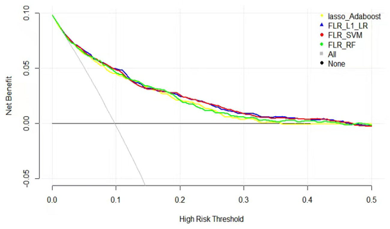The clinical effectiveness of FLR-L1-LR, FLR-SVM, FLR-RF, and Lasso-AdaBoost based on the results of the decision curve are shown in Figure 3. It is evident that the clinical application value of the FLR-L1-LR model is higher than that of FLR-SVM, Lasso-AdaBoost, and FLR-RF (Figure 3, Table 3). Under the optimal threshold, we assumed that all participants were in a high-risk group for CVD. We then administered undifferentiated interventions for primary and secondary prevention. The net benefit of using the FLR-L1-LR model was 0.061. This showed that without increasing the positive results, 49 out of every 1,000 people could avoid unnecessary interventions.
