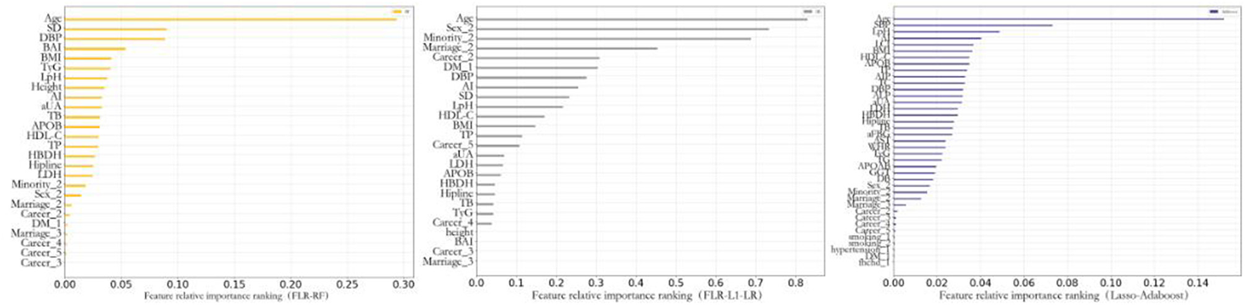 The research database included demographic characteristics, physical examination findings, and serology results. There were 62 variables in total. After removing the missing ratio of ≥50% and 11 variables unrelated to the research, a total of 51 variables were included. The following methods were used to filter and establish a subset of variables: FLR-LR (22 variables) and Lasso-LR (34 variables). The top 35 variables were selected according to the built-in random forest importance. The top 30 variables were subsequently selected as the screening subset according to permutation feature importance of RF. The variable subsets formed by the selected variables using the four methods are shown in Supplementary Tables 3–6.