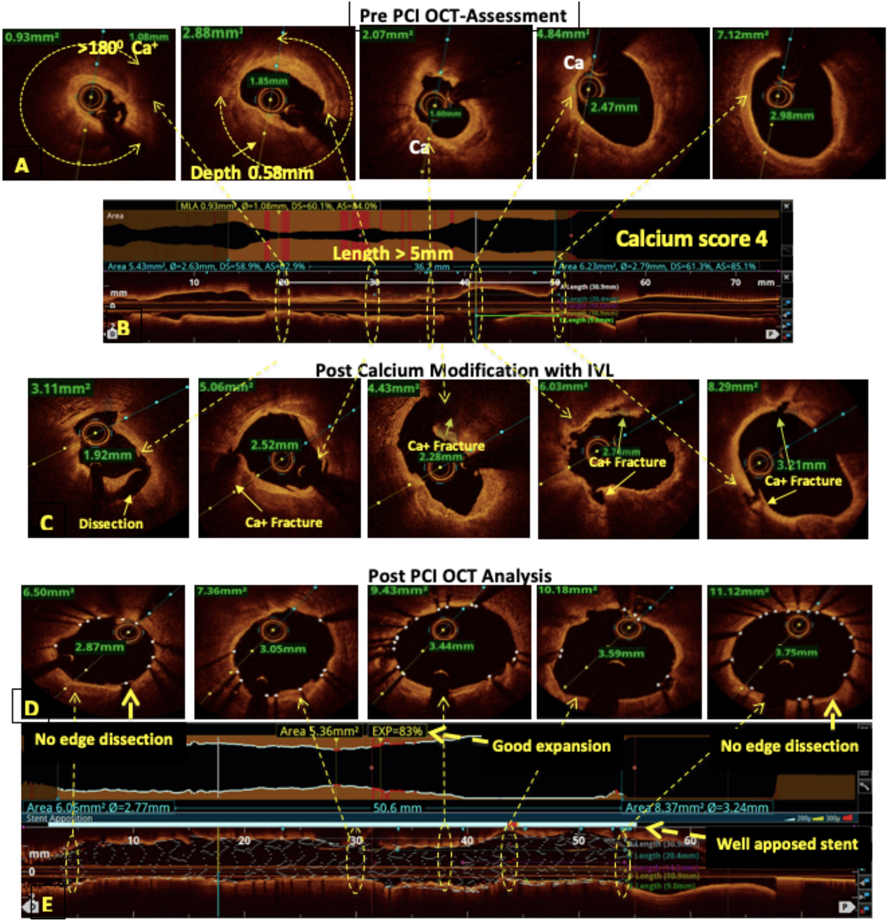 Intracoronary OCT provides a detailed characterization of the arterial wall and lumen, which is complimentary to angiography. It plays a key role in the pre-PCI assessment of plaque morphology to choose an appropriate plaque modification device. Lesion length and coronary diameter can be accurately measured using EEL to guide the required stent size. Post-PCI optimization includes the assessment of stent apposition, stent expansion, significant edge dissection, geographical miss, and plaque prolapse.