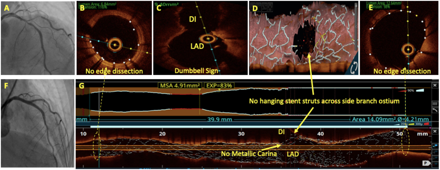 - Final median MSA was 5.79 mm2 with OCT and 5.49 mm2 with angiography guidance. OCT guidance was not superior to angiography guidance (p = 0.12) - Minimum and mean stent expansion was significantly improved by OCT [87.6% and 105.8%] as compared with angiography (82.9%, P = 0.02 and 101.4%, P = 0.001, respectively) - Untreated major dissections at end of procedure and major malapposition were significantly less in OCT guided group (28 and 11%) compared with angiography group (44%, P = 0.006 and 31%, P < 0.0001) |