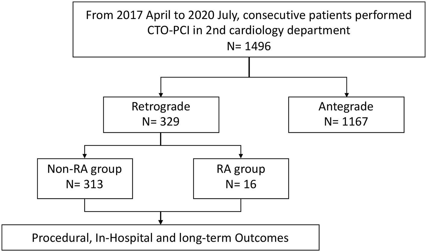 A total of 329 patients who underwent retrograde CTO-PCI, out of 1496 consecutive CTO-PCI patients from April 2017 to July 2020, were retrospectively recruited from the 2nd Cardiology Department of the Guangdong Provincial People's Hospital. 16 patients underwent RA (RA group) whilst 313 did not (non-RA group).