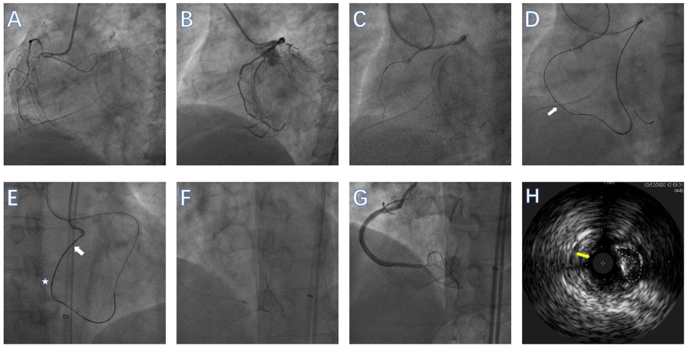 Performing GuidezillaTM reverse controlled antegrade and retrograde subintimal tracking (CART) during rotational atherectomy (RA) in a right coronary artery (RCA) CTO lesion. (A) RCA in left anterior oblique view showing an ambiguous proximal cap without obvious calcification. (B) RCA in left anterior oblique view showing the distal cap of the RCA. (C) Antegrade wire in the subadventitial space of mid-RCA. (D) The CTO lesion was crossed over using the GuidezillaTM reverse CART technique (the white arrow represents the dilated balloon). (E) Retrograde wire (white arrow) was advanced into the GuidezillaTM (white star) of the RCA and externalized. (F) Rotational atherectomy was then performed using a 1.25-mm burr. (G) Angiography after successful CTO-PCI. (H) Intravascular ultrasound confirmed that the guidewire (yellow arrow) was in the subadventitial space (The white dotted line represents the true lumen of the vessel).