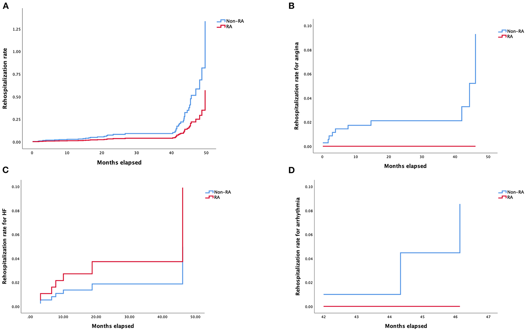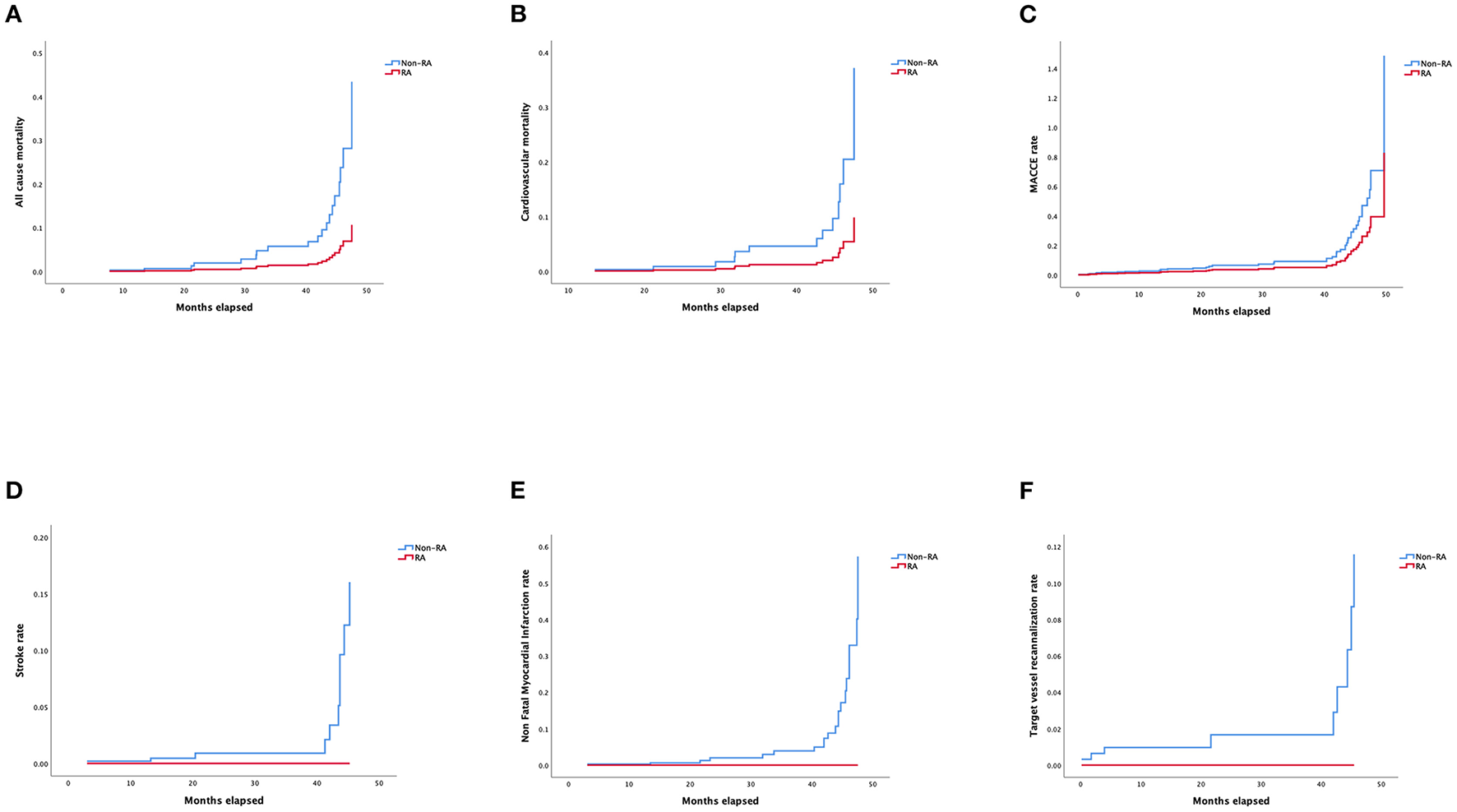 Technical (87.5% vs. 87.5) and procedural (85.9% vs. 87.5) success rates were similar between both groups. There was no difference concerning major procedural complications between groups (12.5% vs. 19.2%; p > 0.75). No in-hospital MACCEs was recorded in the RA group while there were eight MACCEs in the non-RA group (p > 0.99). In the RA group, 2 cases recorded perforation (1 target vessel perforation case and 1 branch vessel perforation), and 55 cases of vessel perforations/dissections were recorded in non-RA group including 18 target vessel perforations, 2 branch vessel perforations, 35 collateral vessel perforations (one patient died from cardiac tamponade). No difference was found in terms of the perforation rate between the two groups (p > 0.99). Over a mean follow-up period of 26.47 ± 14.46 months, use of RA in retrograde CTO-PCI did not result in an increased mortality rate [hazard ratio (HR) 1.58, 95% confidence interval (CI), 0.31–8.21, p = 0.65], major adverse cardiac and cerebral events (HR 0.99, 95% CI 0.35–2.79, p = 0.99) or overall rehospitalization rate (HR 1.27, 95% CI 0.44–3.67, p = 0.67). Adjusted Kaplan–Meier curves according to Cox regression model suggested several predictors influencing the all-cause mortality, cardiovascular mortality, MACCEs, stroke rate, non-fatal myocardial infarction, target vessel recanalization rate and rehospitalization rate in the comparison.