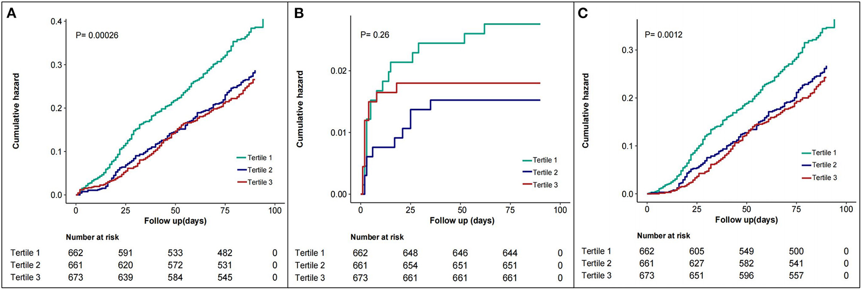 The composite outcome occurred in 535 (26.8%) participants at 3 months. Over the same period, there were 213, 165, and 157 composite endpoint events for tertile 1 to 3, respectively. There was a highest event incidence rate of 32.2% in tertile 1 compared with that in tertile 2 and 3 (25.0 and 23.3%, respectively). The spline analysis supported a linear association with the composite endpoint over the range of chloride within this population (p = 0.311 for non-linearity, Figure 2). Similar linear association with serum chloride and readmission rate was also observed (p = 0.128 for non-linearity, Supplementary Figure S1). However, there seems to be a U-shaped relationship between serum chloride and all-cause mortality (p = 0.023 for non-linearity, Supplementary Figure S2).