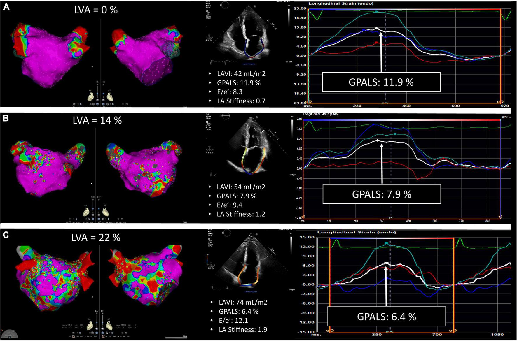 Representative example of echocardiographic strain analysis performed in three patients with different severity of left atrial (LA), low-voltage area (LVA) extent. Group I: no LVA (A), group II: moderate LVA extent (B), and group III: important LVA extent (C). The color gradient of the LVA maps indicates electrogram amplitude from pink (>0.5 mV in SR and >0.31 in AF) to red at <0.1 mV.