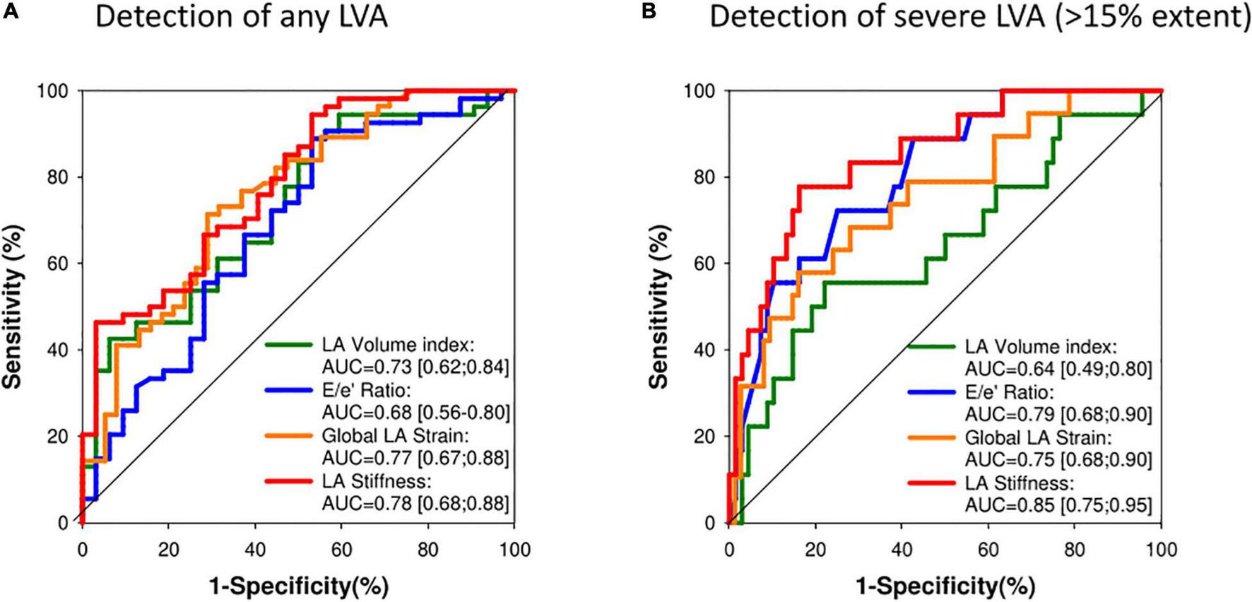Multivariable regression showed that LAVI, GPALS, and LA stiffness independently predicted LVA extent after correcting for age, glomerular filtration rate, and CHA2DS2-VASc score. Of all the parameters, LA stiffness index had the highest diagnostic accuracy (AUC 0.85), allowing using a cut-off value ≥0.7 to predict moderate or high LVA with 88% sensitivity and 47% specificity, respectively. In multivariable Cox analysis, both GPALS and LA stiffness were able to significantly improve the c statistic to predict AF recurrence (n = 40 over 9 months FU) over CHARGE-AF (p < 0.001 for GPALS and p = 0.01 for LA stiffness) or CHA2DS2-VASc score (p < 0.001 for GPALS and p = 0.02 for LA stiffness). GPALS and LA stiffness also improved the net reclassification index (NRI) over the CHARGE-AF index (NRI 0.67, 95% CI [0.33–1.13] for GPALS and NRI 0.73, 95% CI [0.12–0.91] for LA stiffness, respectively), and over the CHA2DS2-VASc score (NRI 0.43, 95% CI [−0.14 to 0.69] for GPALS and NRI 0.52, 95% CI [0.10–0.84], respectively) for LA stiffness to predict AF recurrence at 9 months.