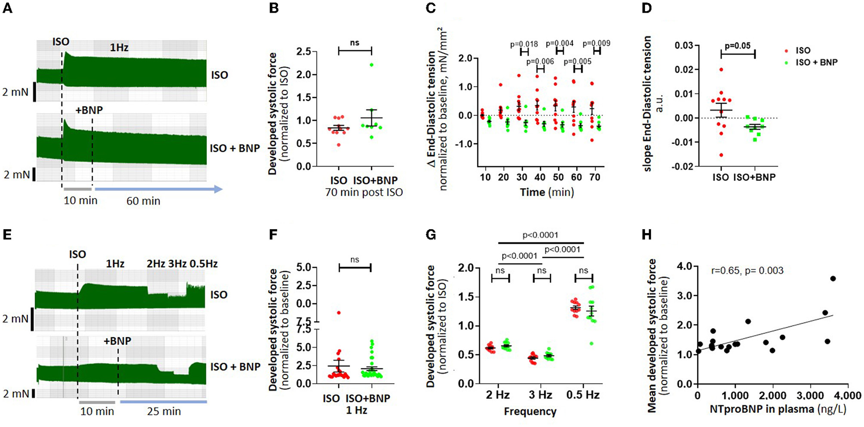 Effect of BNP on atrial inotropy and lusitropy after adrenergic stimulation. Example traces of time-dependent analysis of BNP (n = 20 strips) are shown in (A), with the corresponding data on the effect of BNP treatment on atrial systolic force (B), and end-diastolic tension generation (C) after 70 min. The slope of end-diastolic tension over time is shown in (D). The effects of a frequency-variation protocol [example traces in (E), n = 40 strips] on systolic force at different stimulation frequencies are shown in (F,G). Correlation of patient plasma NTproBNP and relative force increase after ISO treatment (values from n = 19 patients with available NTproBNP) is shown in (H). Data are shown as mean ± SEM; each data point represents one muscle strip. In (H), each point represents the mean developed systolic force per patient. ISO, isoproterenol; BNP, brain natriuretic peptide.