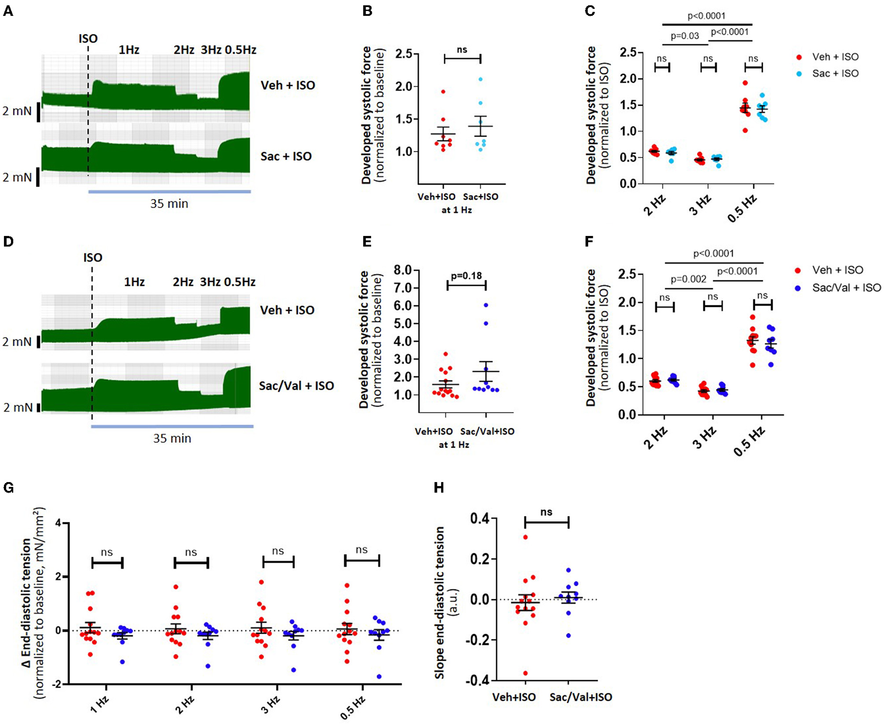 Effect of Sac/Val on atrial inotropy and lusitropy after adrenergic stimulation. Example traces of a “frequency-variation protocol” in Sac-treated muscle strips (n = 15 strips) are shown in (A), with its effects on developed force during different frequencies shown in (B,C). Examples traces of a frequency-variation protocol in Sac/Val treated muscle strips (n = 24 strips) are shown in (D), with the corresponding effects on developed force in (E,F). The effects of Sac/Val on end-diastolic tension are shown as per stimulation frequency (G) and as the diastolic tension slope derived from linear regression (H). Data are shown as mean ± SEM; each data point represents one muscle strip. ISO, isoproterenol, Sac: Sacubitrilat; Val: valsartan; Veh: vehicle (DMSO).