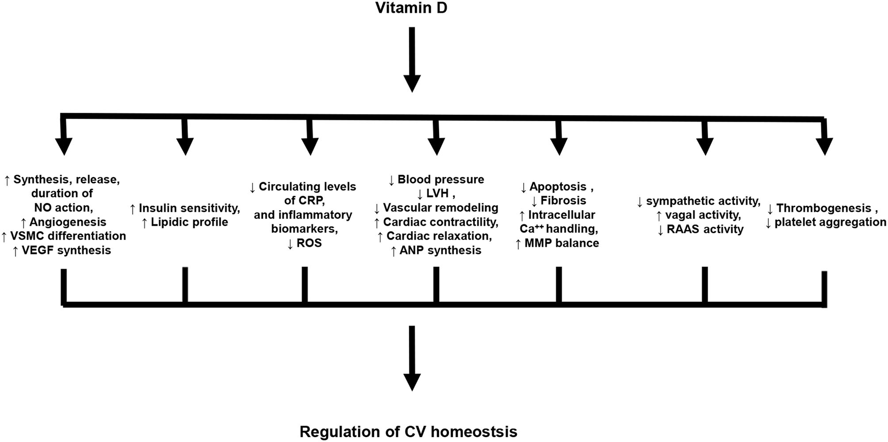 One of the most controversial aspects of modern medical literature is represented by the role that vitamin D has in cardiovascular (CV) prevention. In fact, several epidemiological studies have reported that the deficiency of vitamin D is associated with conventional CV risk factors, as well as with a high rate of major CV events, and with adverse CV prognosis (1, 2). On the other hand, observational studies, randomized controlled trials (RCT), and meta-analyses of RCT have failed to demonstrate that dietary vitamin D supplementation is able to ameliorate the prognosis of CV diseases (3–5). Several study limitations can account for these conflicting results. In particular, in the majority of trials the value of vitamin D was detected in basal conditions, whereas was not measured at the end of treatment. Furthermore, in diverse studies, different doses and preparations of vitamin D supplements were used and supplement duration was heterogeneous. Finally, the differences in the designs, in the sample size, in the clinical characteristics of the patients enrolled in trials further contributed to generate inconsistent results. However, it is also reasonable to speculate that vitamin D deficiency, rather than being an independent risk factor, could be the expression of the effects of other determinants of CV risk, compromising the availability and/or the biological activity of the vitamin. In general, it is possible to assert that deficiency of vitamin D is a hallmark of poor healthy condition (6). If this is the case, the supplementation of vitamin D is necessary, but not sufficient to ameliorate CV risk profile and prognosis. Thus, the identification and the correction of concomitant pathogenic mechanisms that impair vitamin D action is required to improve vitamin D-based strategies in CV prevention.