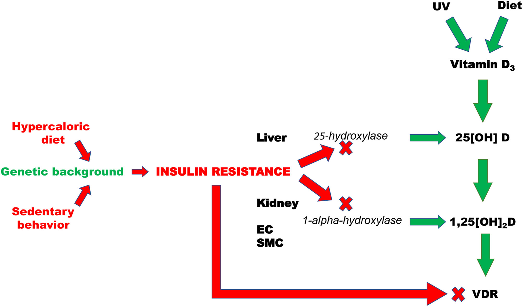 Pathogenic mechanisms that are responsible of insulin resistance-induced deficit of vitamin D. EC, Endothelial cells; SMC, smooth muscle cells; VDR, vitamin D receptor; UV, Ultraviolet radiations.