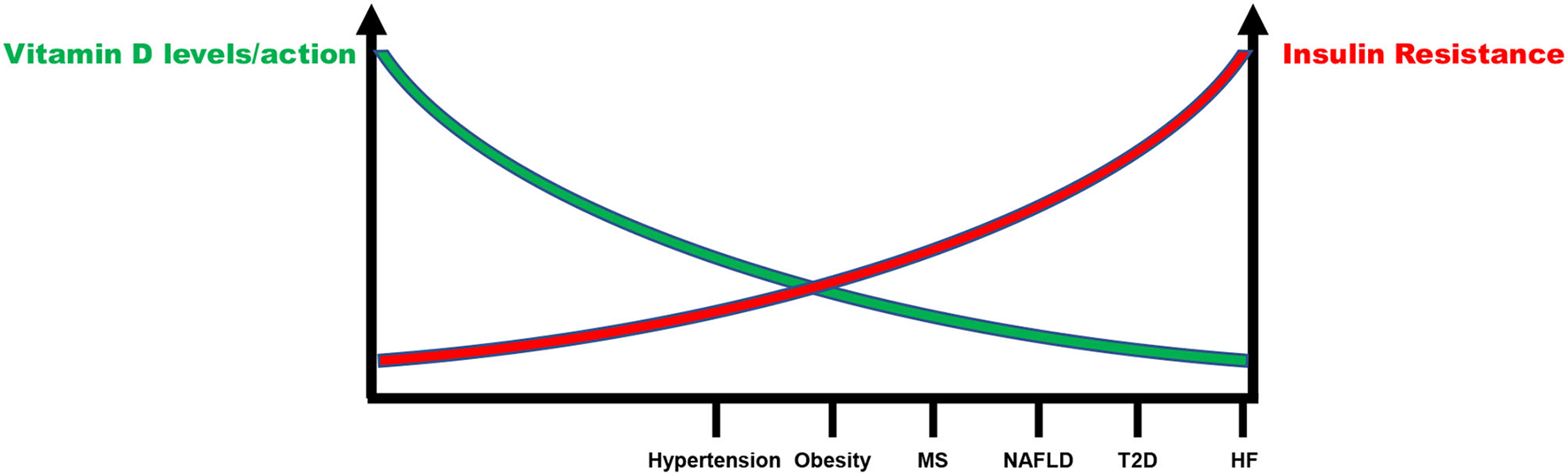 Inverse relationship between insulin resistance and vitamin D status in the continuum of cardiovascular disease. MS, Metabolic syndrome; NAFLD, Non-alcoholic fatty liver disease; T2D, Type 2 diabetes; HF, Heart failure.